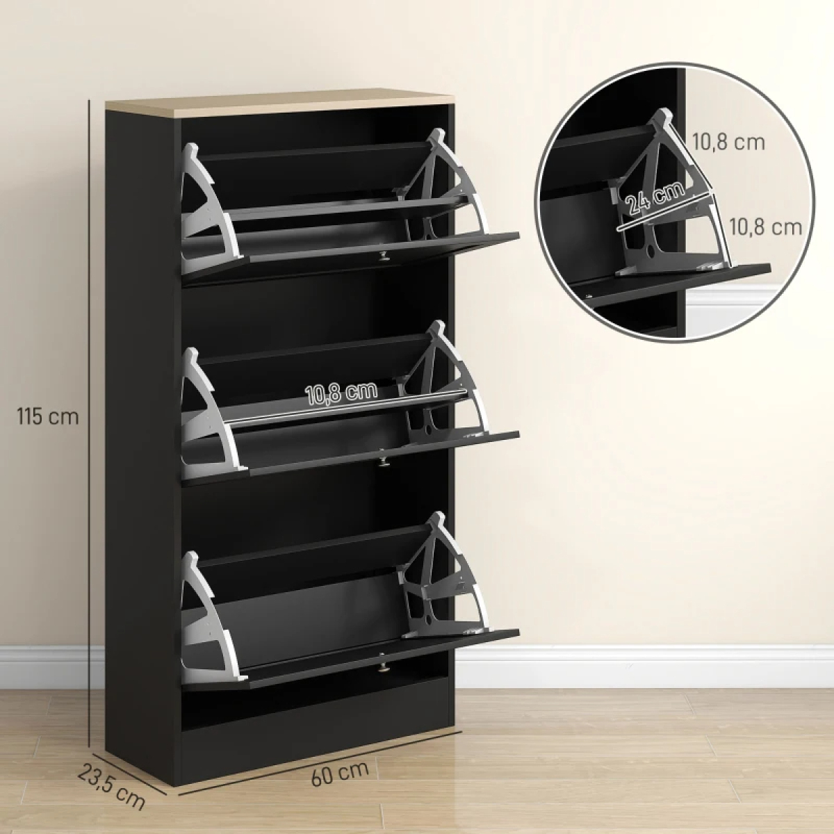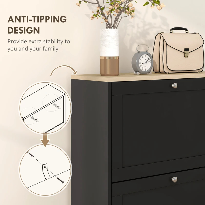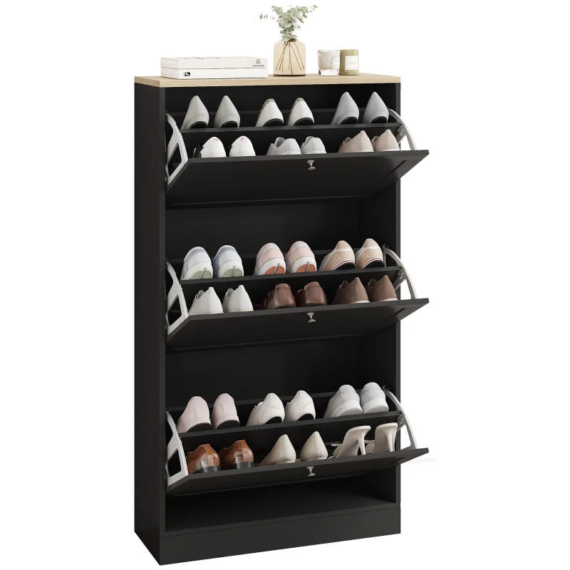 For those who move house frequently, HOMCOM's portable shoe rack is the ideal choice. Designed to fit into small spaces, this modern, easy-to-assemble piece of furniture offers a practical and stylish solution for shoe storage. With three hinged drawers and adjustable shelves, it's perfect for keeping your shoes organized and your home tidy, without compromising on ease of moving and assembly. Features: - Three flip drawers store 12-18 pairs of shoes with a max size of US 11 - Two-level adjustable shelves accommodate various shoe sizes - Tabletop offers extra space for display and storage - Its modern style complements any decor - Its compact design fits in small spaces - Anti-tipping hardware to prevent it from falling over - Melamine-surface particleboard for easy cleaning - Assembly required Specification: - Color: White, Light Oak - Material: Particleboard - Overall Dimensions: 23.6" W x 9.3" D x 45.3" H - Drawer Inner Size: 21.5" W x 12.2" D x 9.4" H - Shoe Capacity: 12-18 Pairs - Max Shoe Size: US 11 - Weight Capacity: 88 lbs. (Overall), 22 lbs. (Drawer/Top) - Item Label: 837-399V80WT Package Includes: - 1 x Shoe Cabinet - 1 x Manual Say goodbye to shoe clutter with a shoe storage cabinet for entryway from HOMCOM. This slim shoe organizer cabinet features three flip drawers that neatly store 12-18 pairs. It also has adjustable shelves to fit various sizes. Its sleek, modern look includes a light oak top and silver handles, making it a stylish addition to any entryway. Enjoy a tidy space with the HOMCOM shoe dresser. Features: - Three flip drawers store 12-18 pairs of shoes with a max size of US 11 - Two-level adjustable shelves accommodate various shoe sizes - Tabletop offers extra space for display and storage - Its modern style complements any decor - Its compact design fits in small spaces - Anti-tipping hardware to prevent it from falling over - Melamine-surface particleboard for easy cleaning - Assembly required Specification: - Color: Black, Light Oak - Material: Particleboard - Overall Dimensions: 23.6" W x 9.3" D x 45.3" H - Drawer Inner Size: 21.5" W x 12.2" D x 9.4" H - Shoe Capacity: 12-18 Pairs - Max Shoe Size: US 11 - Weight Capacity: 88 lbs. (Drawer/Top) - Item Label: 837-399V80BK Package Includes: - 1 x Shoe Cabinet - 1 x Manual.