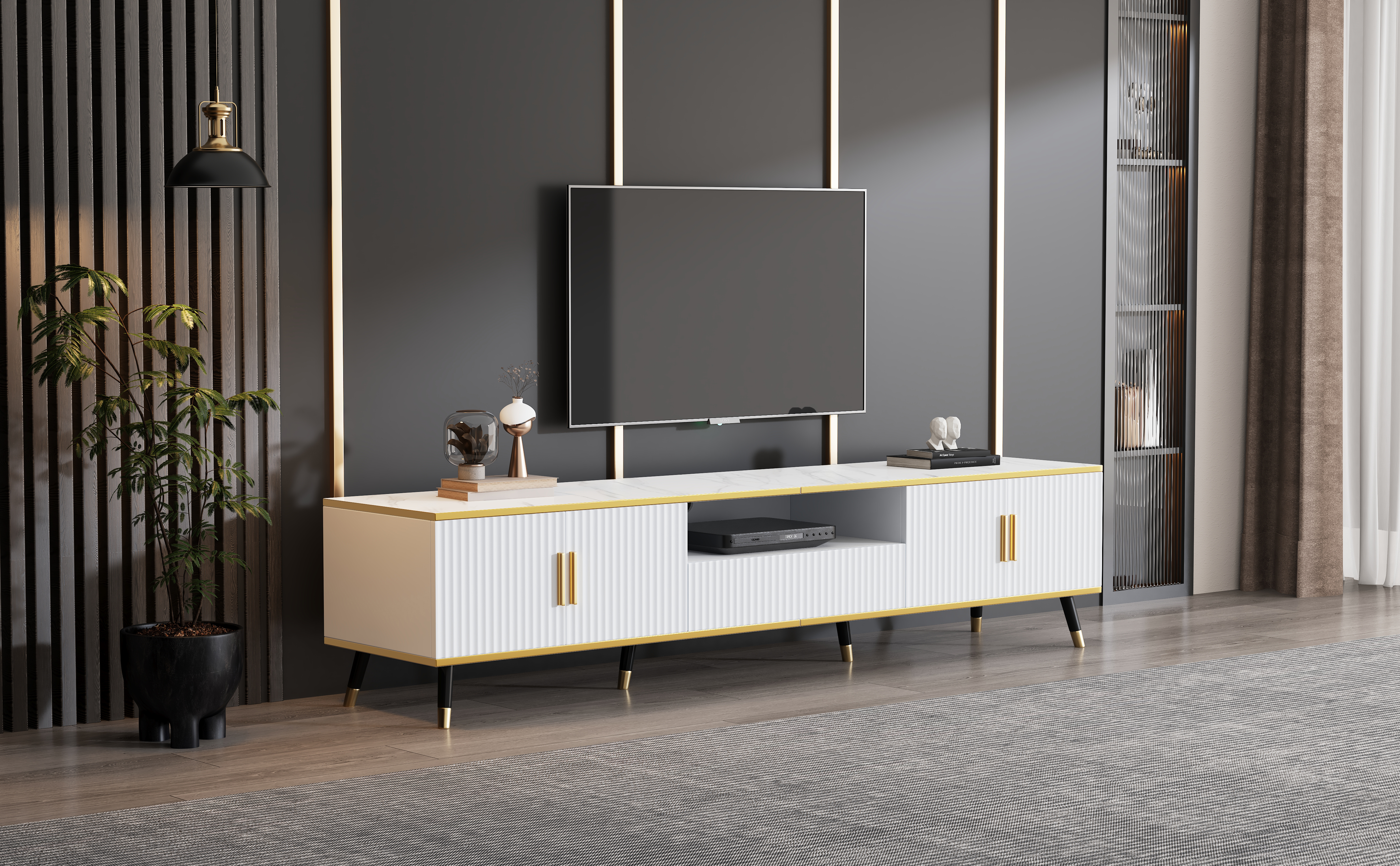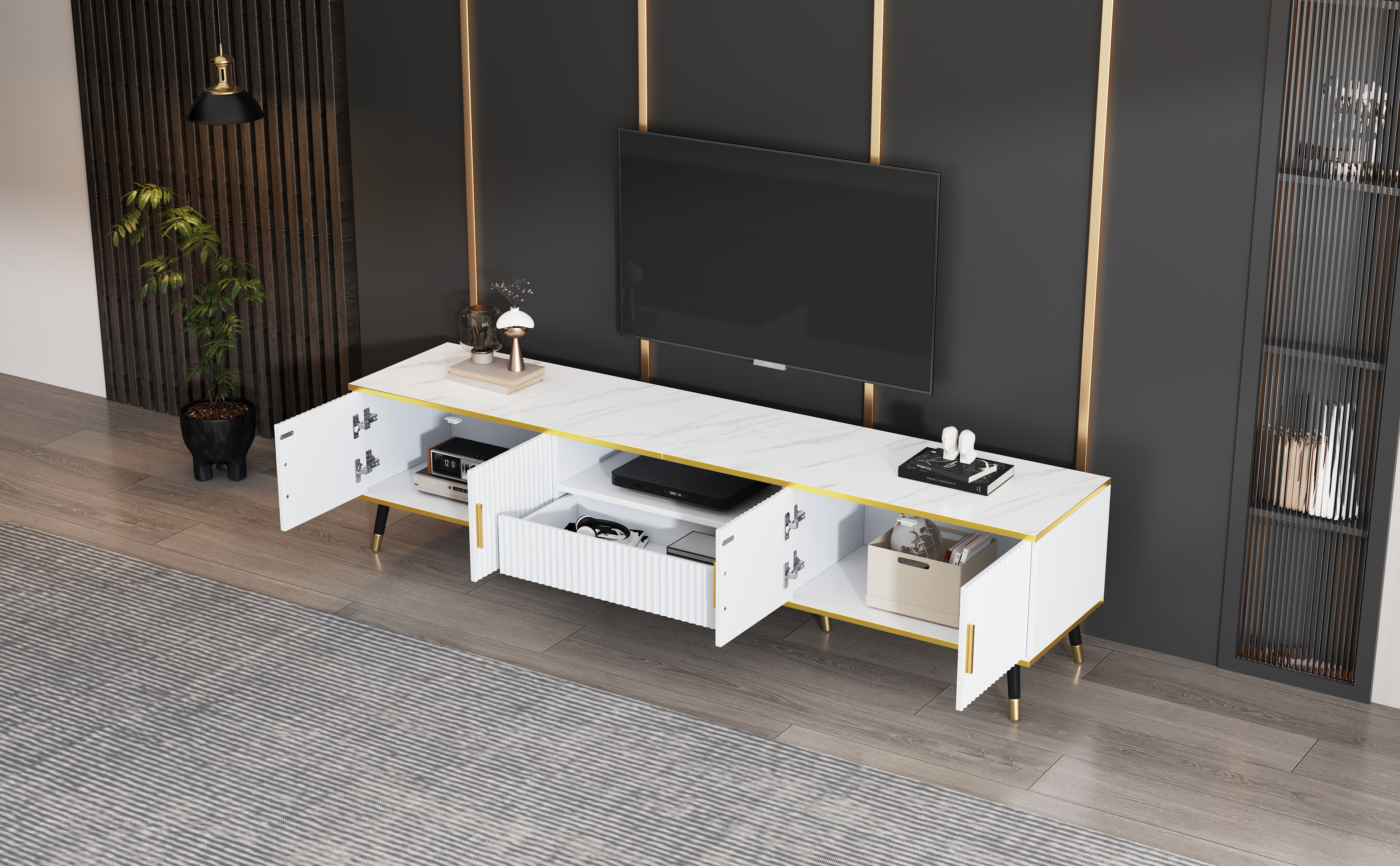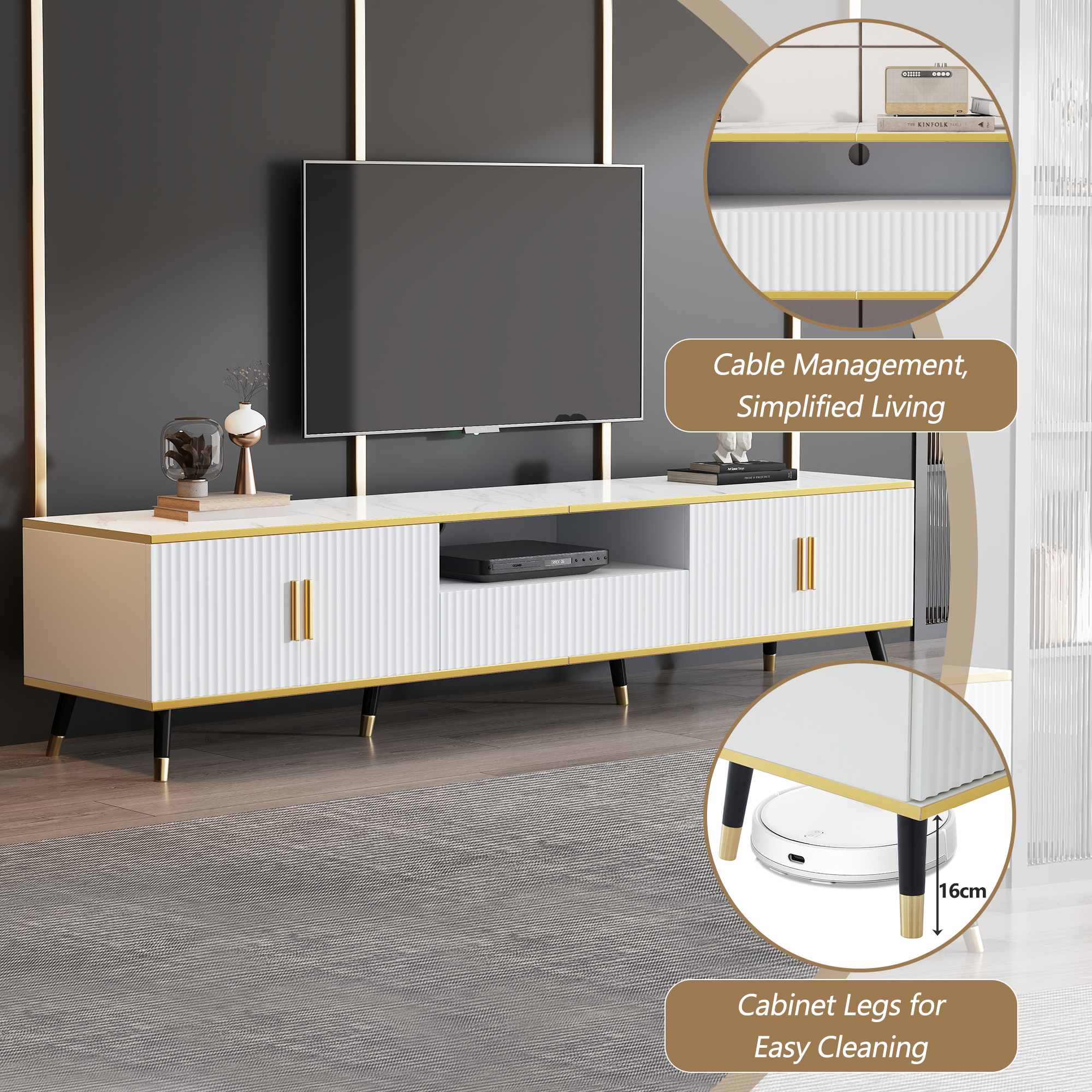 - A scientifically planned 4-door, 1-drawer storage structure provides ample hidden storage space for set-top boxes, game consoles, audio-visual cables, and household miscellaneous items, keeping the space tidy and aesthetically pleasing.