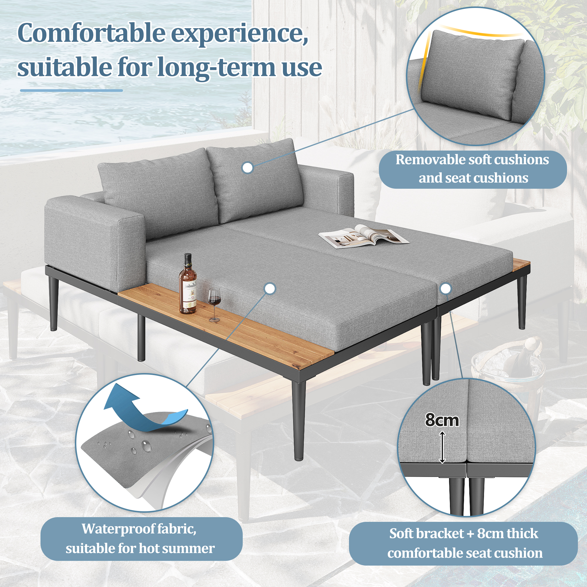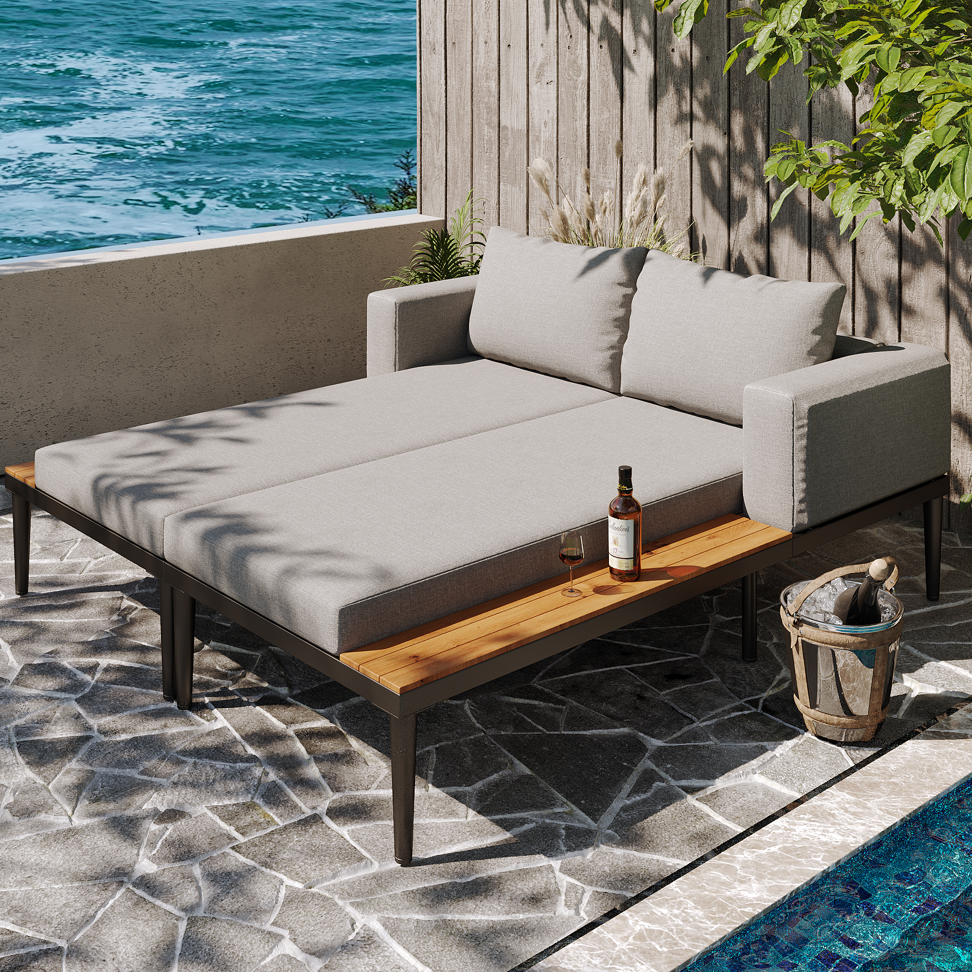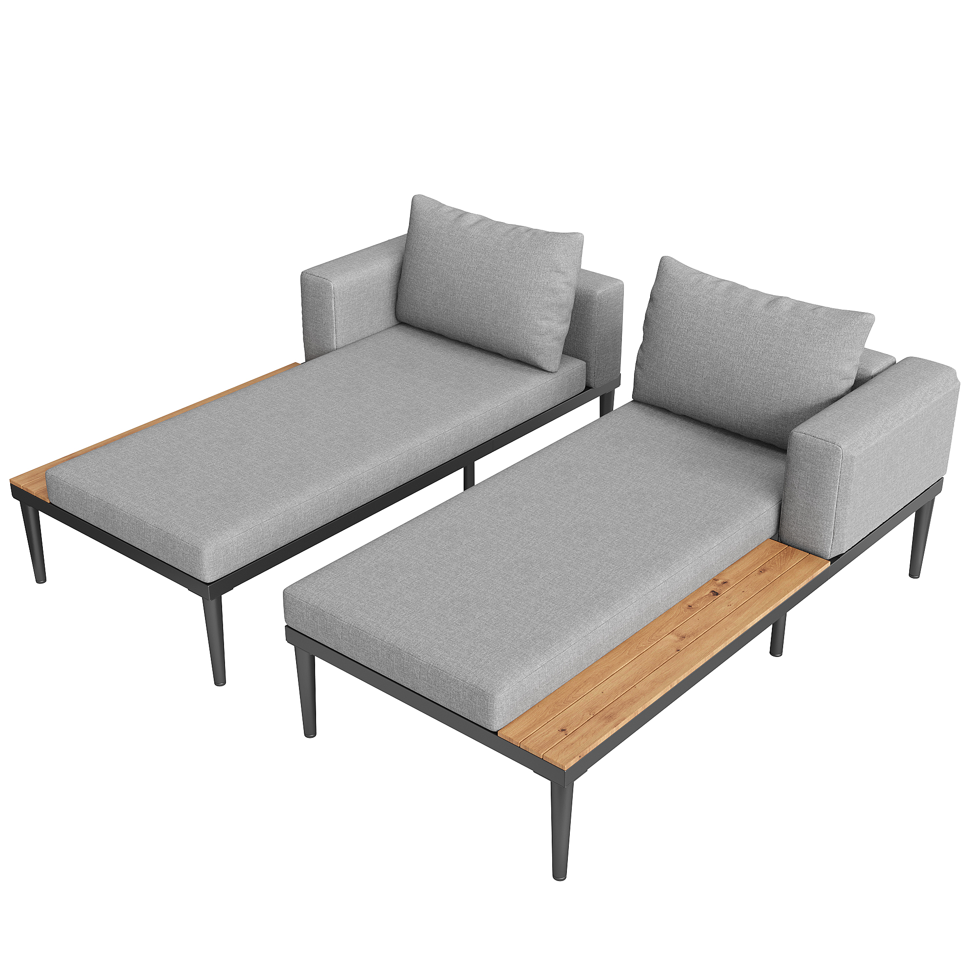 Product Name:Modular Outdoor Double Chaise Lounge with Wooden Side Panels, Waterproof Cushions, Sturdy Iron Frame, for Patio & Poolside
