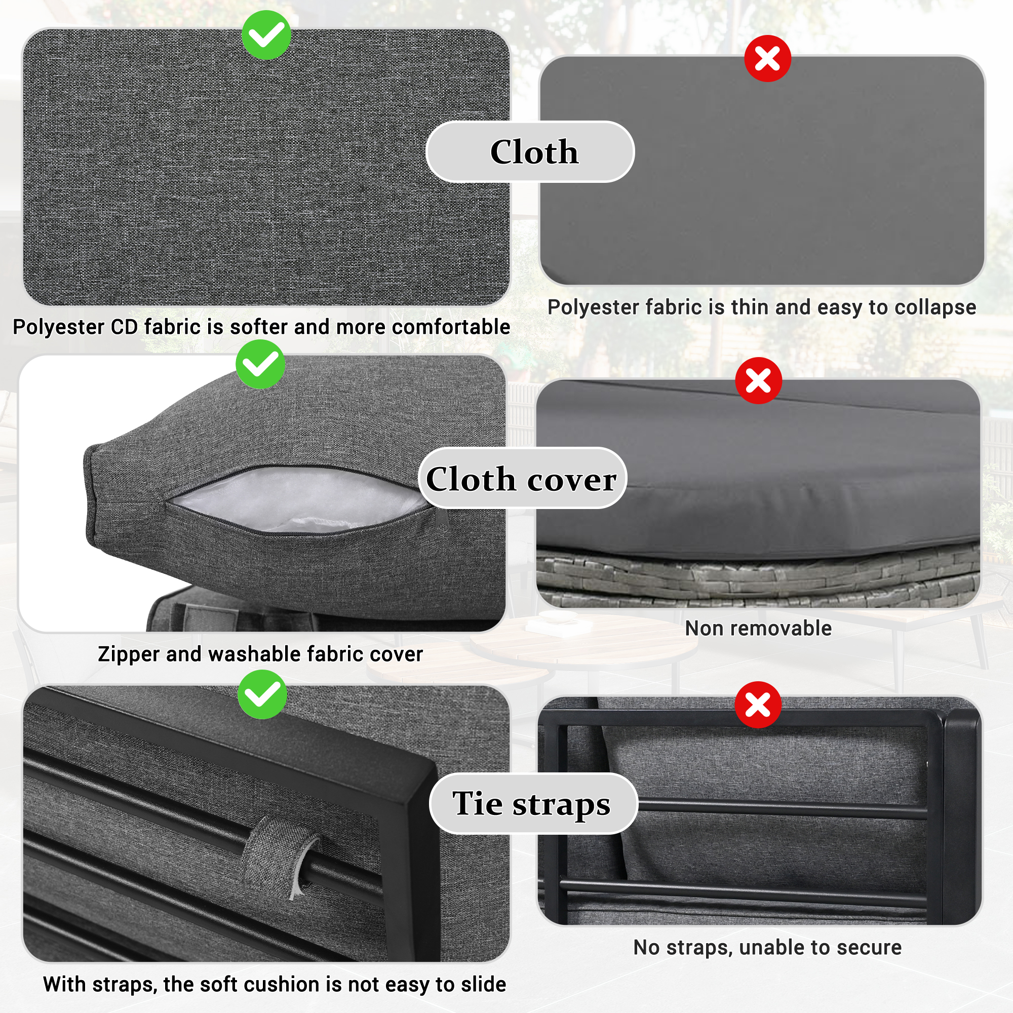 This outdoor furniture set features a fully modular design, allowing you to freely combine the sofa modules, single chairs, and nesting tables to create the perfect seating arrangement for any occasion—whether it's a casual tea time, a business talk, a friends' gathering, or a movie night. The galvanized iron frame ensures durability and stability, while the high elastic base provides a comfortable, supportive feel. The adjustable foot pads make it easy to level the set on any surface, ensuring stability and preventing wobbling.
