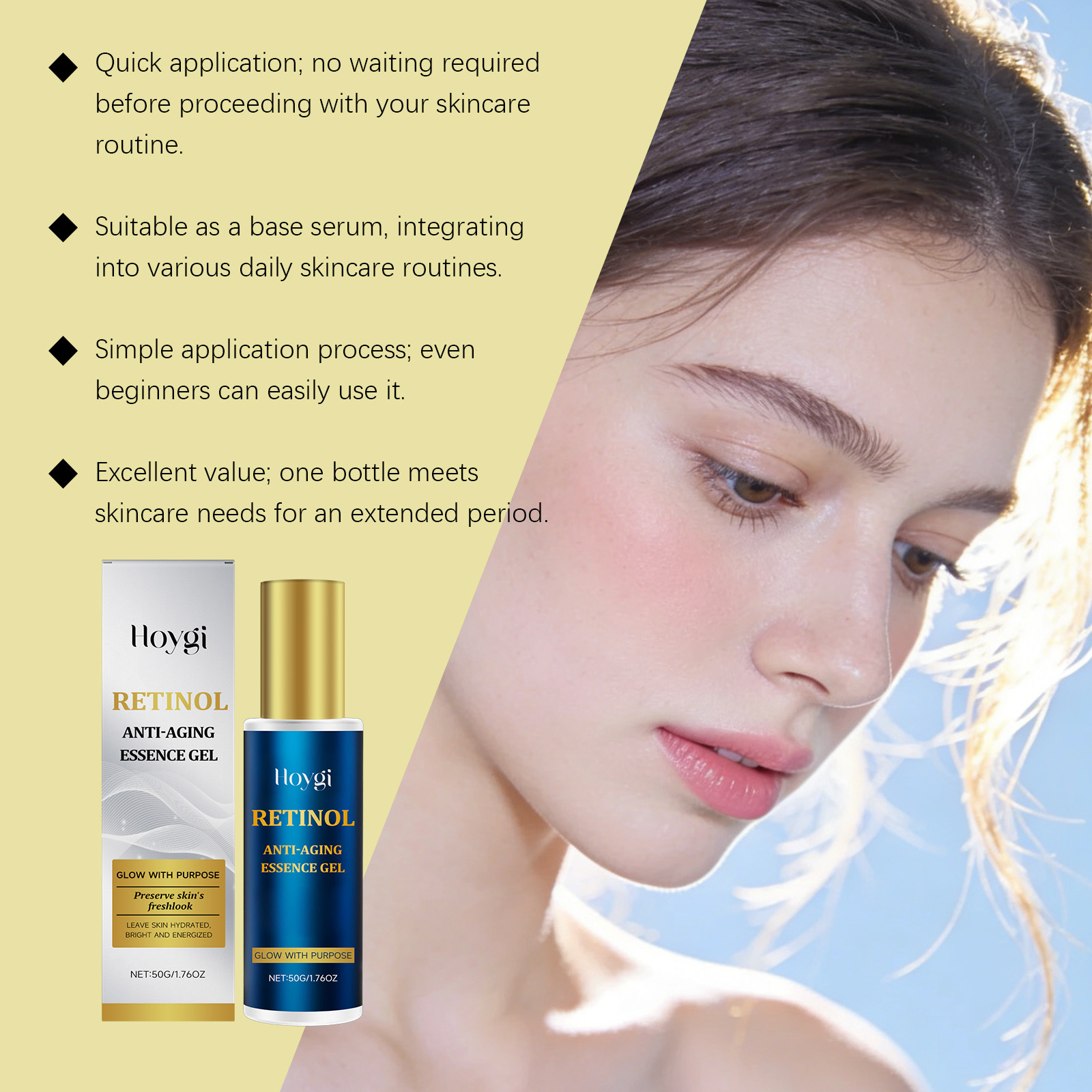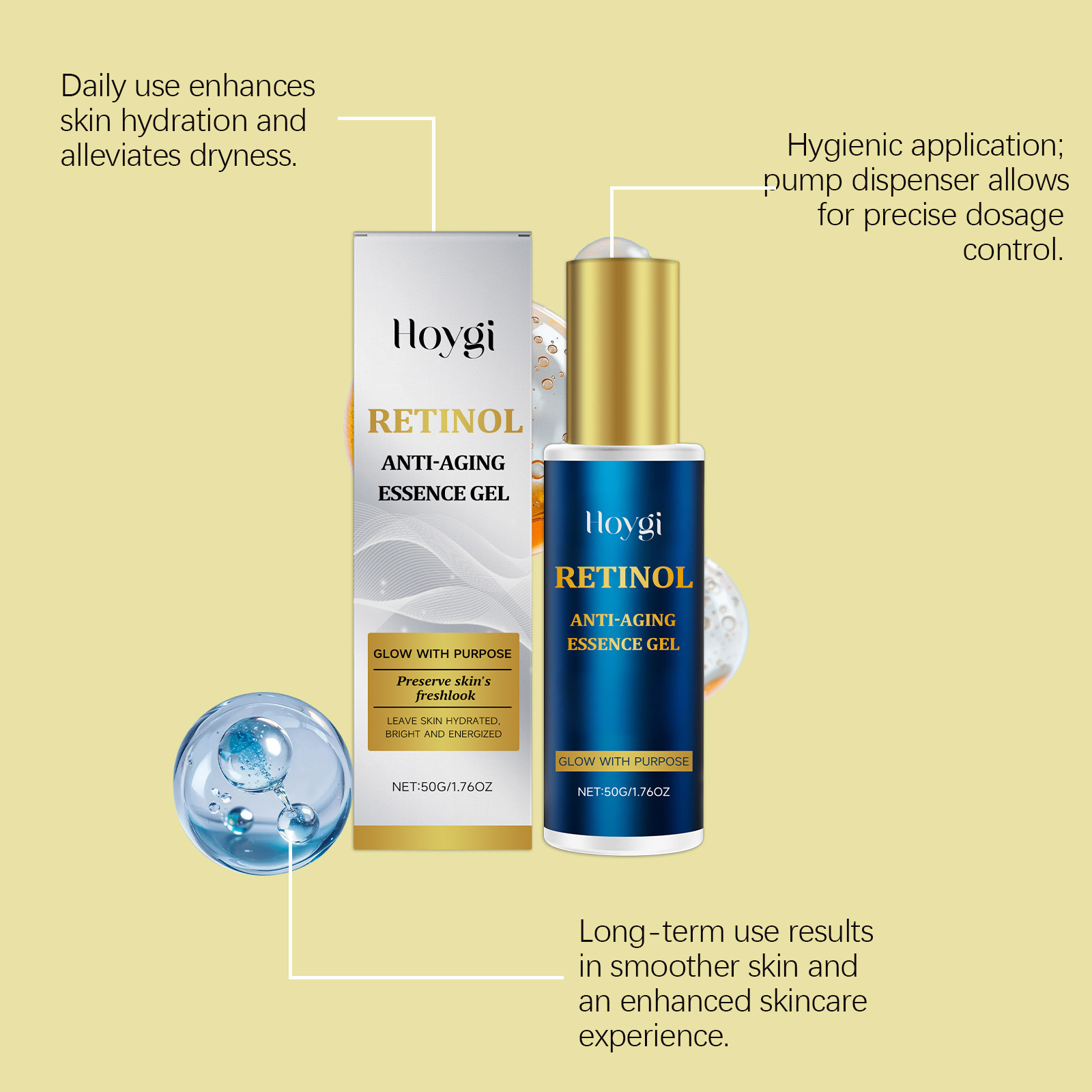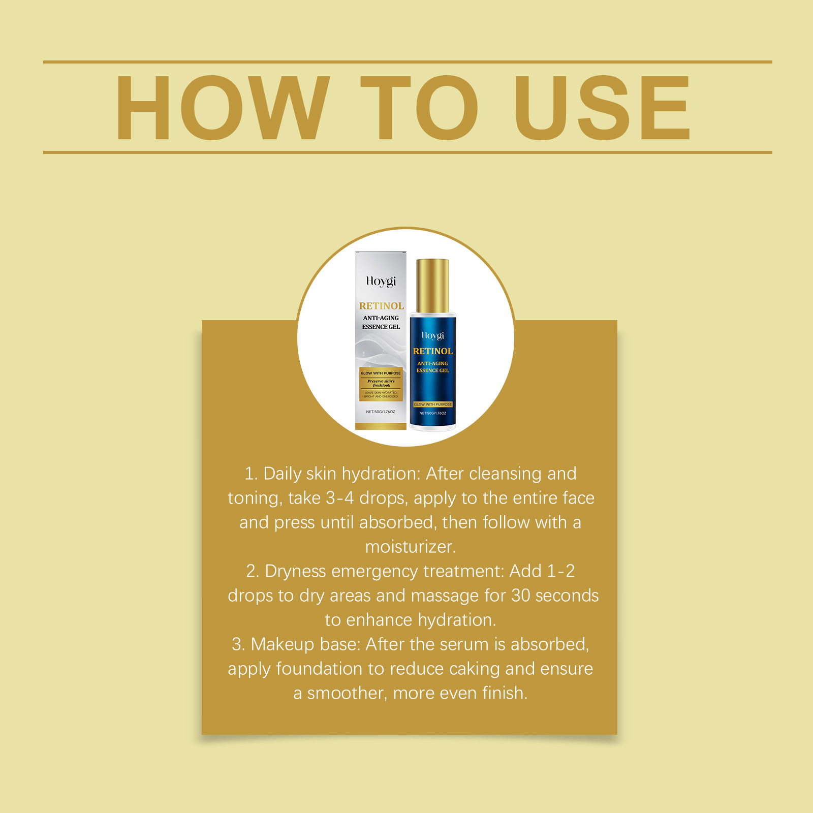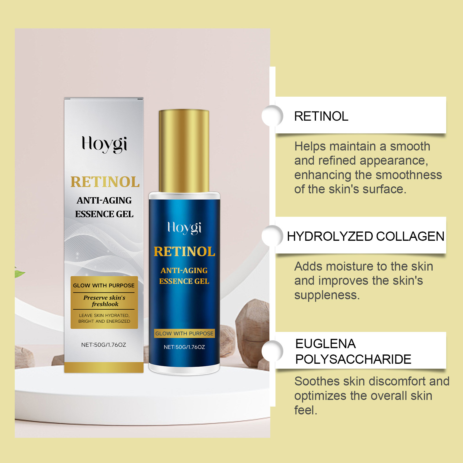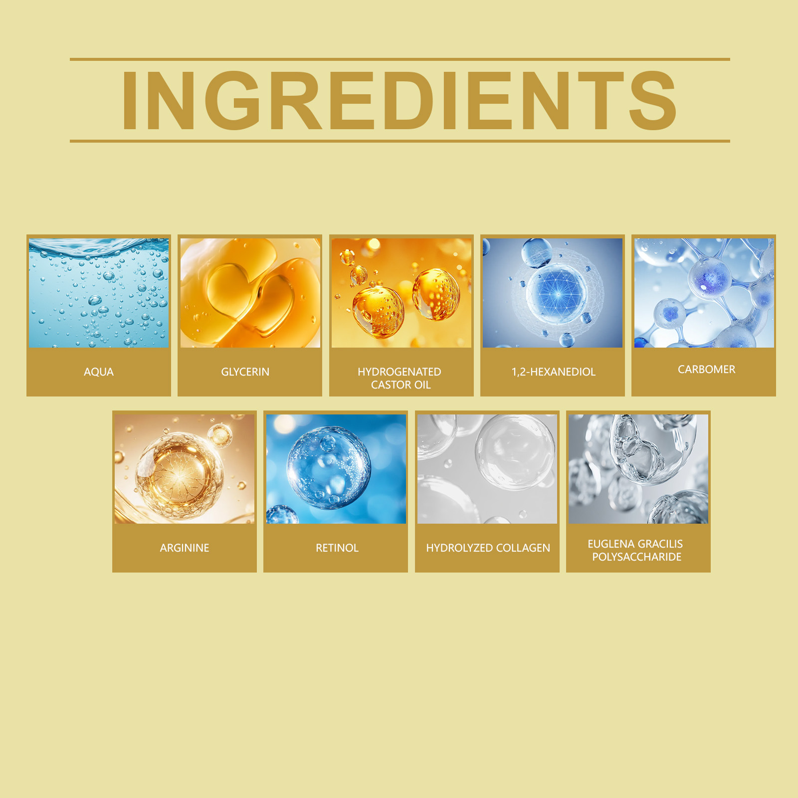 Ingredients: water, glycerin, hydrogenated castor oil, 1,2- hexanediol, carbomer, arginine, retinol, hydrolyzed collagen, and polysaccharide from Euglena parvum.