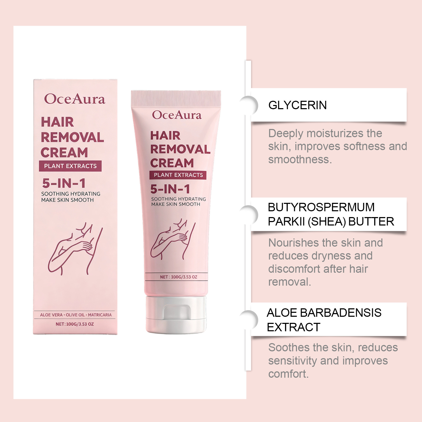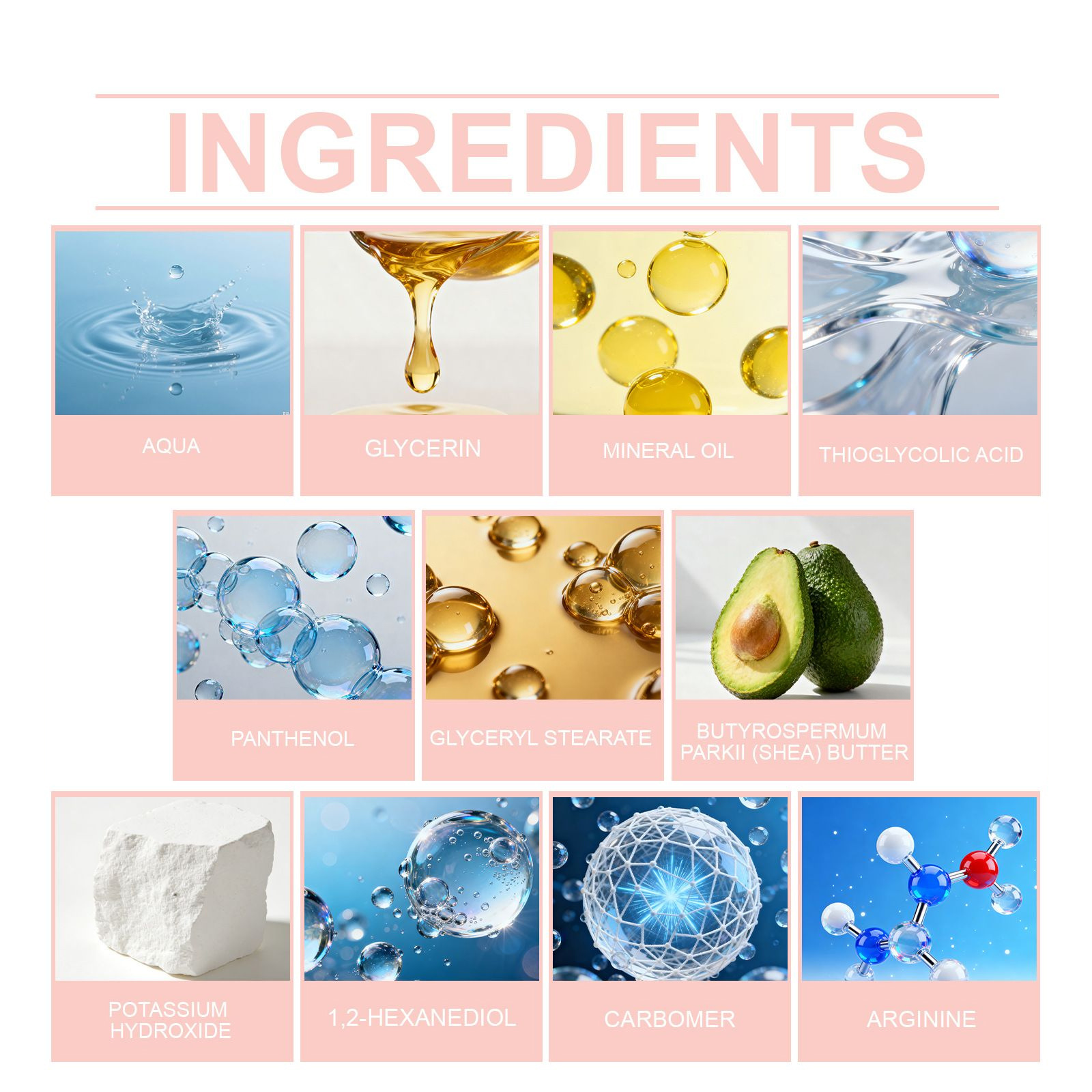 Ingredients: water, glycerin, mineral oil, thioglycolic acid, panthenol, petrolatum, glyceryl stearate, shea butter, potassium hydroxide, 1,2-hexanediol, carbomer, arginine, tocopherol (vitamin E), aloe vera extract, ceramide NP, hyaluronic acid, nicotinamide, potassium olivate and chamomile extract.