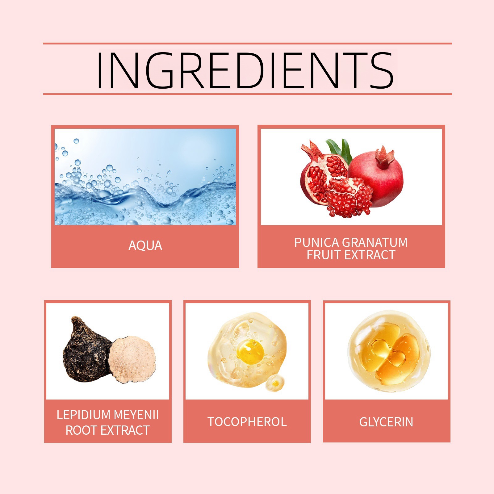 Ingredients: Water, pomegranate extracts, macroot extract, vitamin E (tocopherol), glycerin