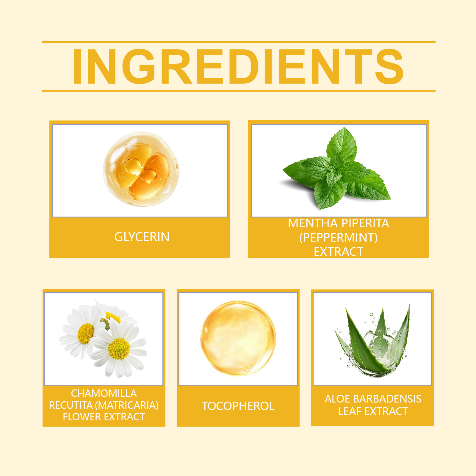 Ingredients: glycerin, mint extract, chamomile flower extract, vitamin E (tocopherol), aloe leaf extract