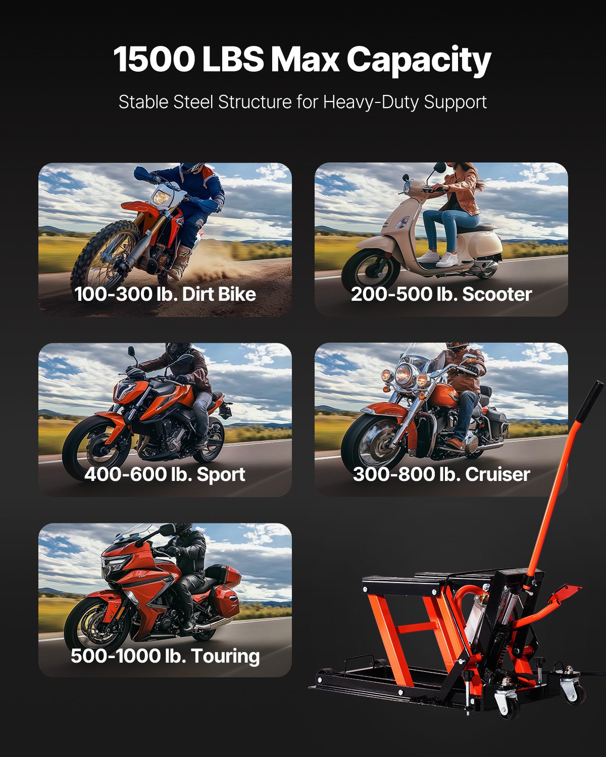 1500 lbs Weight Capacity: With a maximum load capacity of 1500 lbs, this motorcycle lift jack, powered by dual systems, can easily lift most standard motorcycles, touring bikes, cruisers, and more.