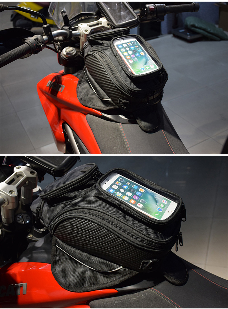 -Ceinture de fixation supplémentaire: l'aimant adhère fermement au réservoir d'huile. Si vous êtes inquiet que les aimants ne puissent pas tenir votre sac pendant la conduite, il y a une ceinture supplémentaire pour fixer le sac.