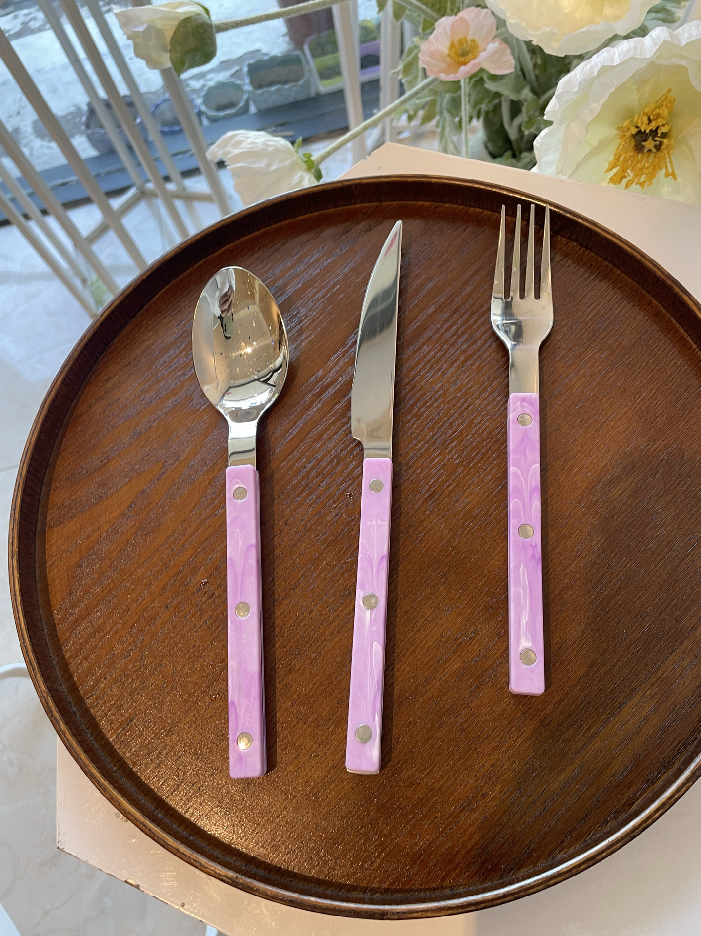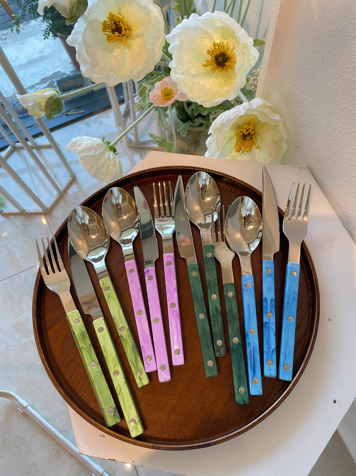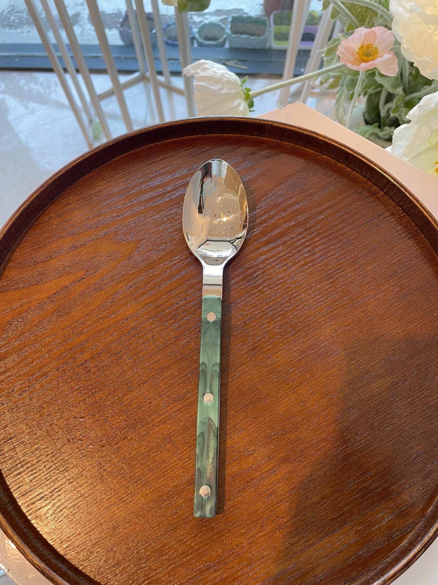 Colors: Light green main dining knife, light green main dining fork, light green main dining spoon; purple main dining knife, purple main dining fork, purple main dining spoon; blue Western-style main dining knife, blue main dining fork, blue main dining spoon; vintage green main dining knife, vintage green main dining fork, vintage green main dining spoon; light green three-piece set, purple three-piece set, blue three-piece set, vintage green three-piece set.