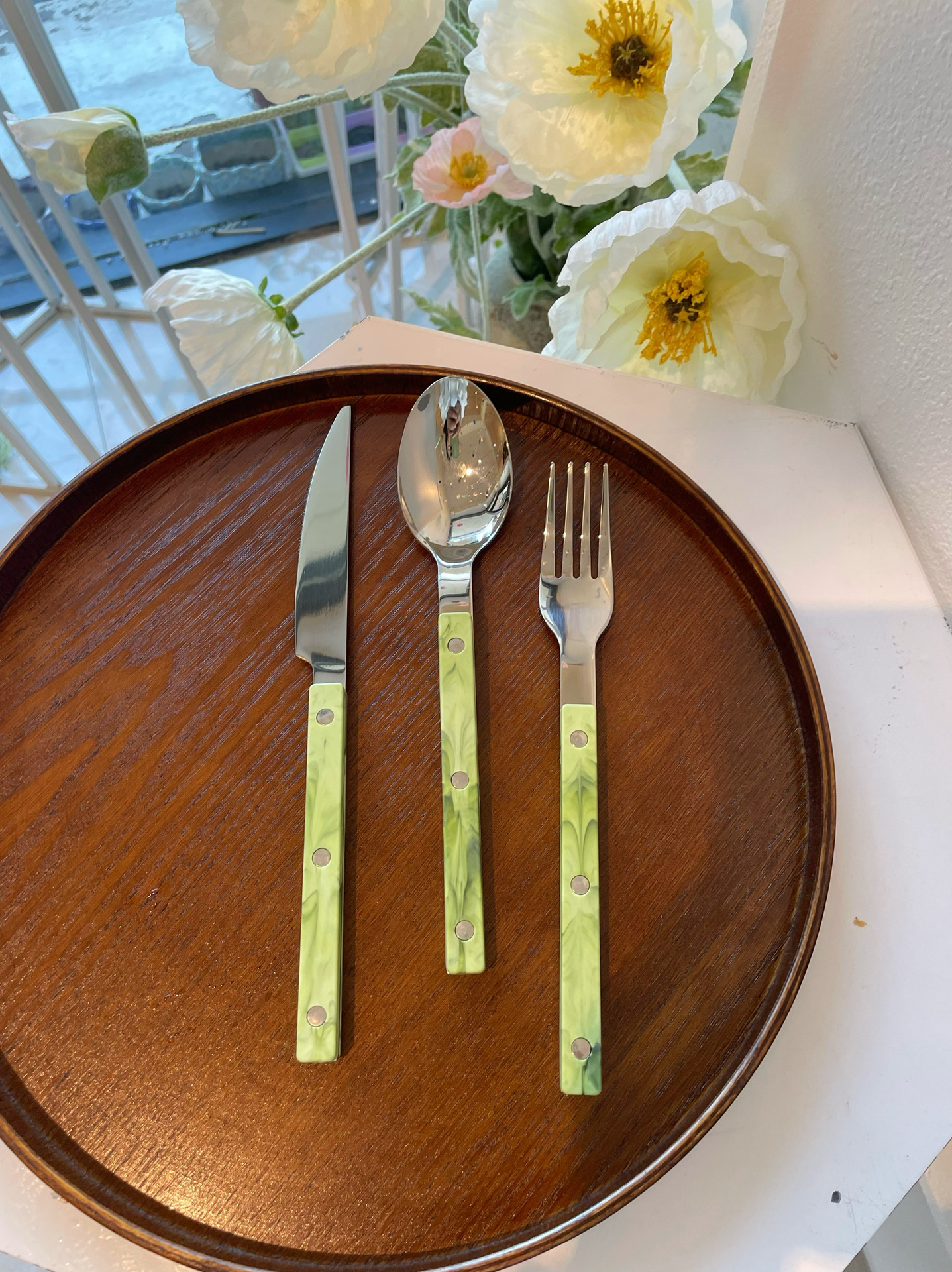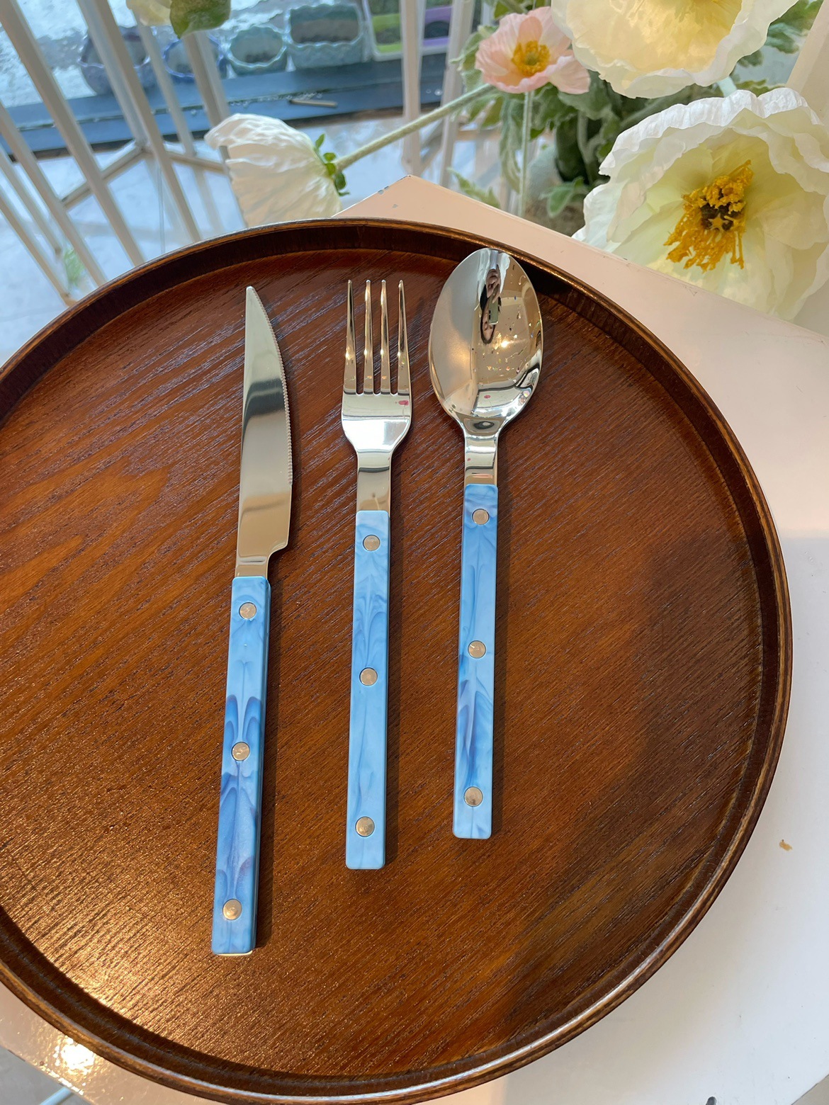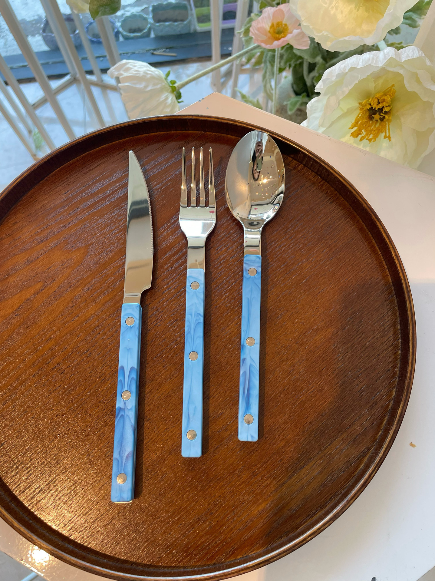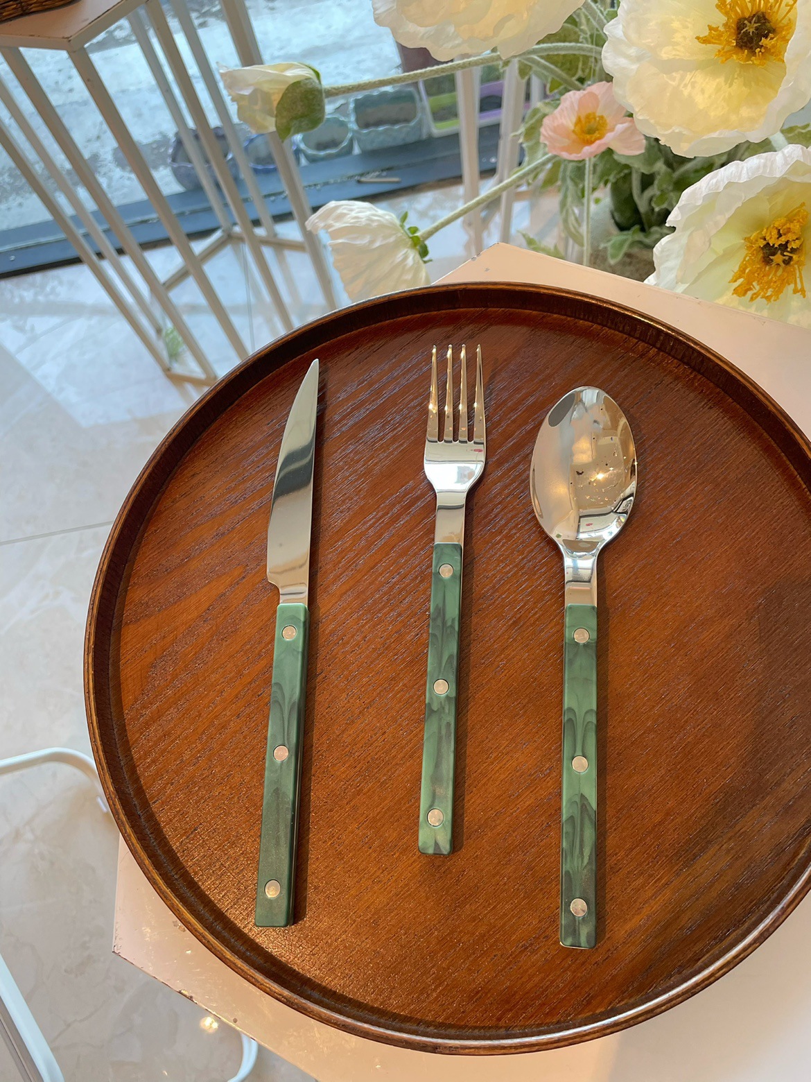 Colors: Light green main dining knife, light green main dining fork, light green main dining spoon; purple main dining knife, purple main dining fork, purple main dining spoon; blue Western-style main dining knife, blue main dining fork, blue main dining spoon; vintage green main dining knife, vintage green main dining fork, vintage green main dining spoon; light green three-piece set, purple three-piece set, blue three-piece set, vintage green three-piece set.