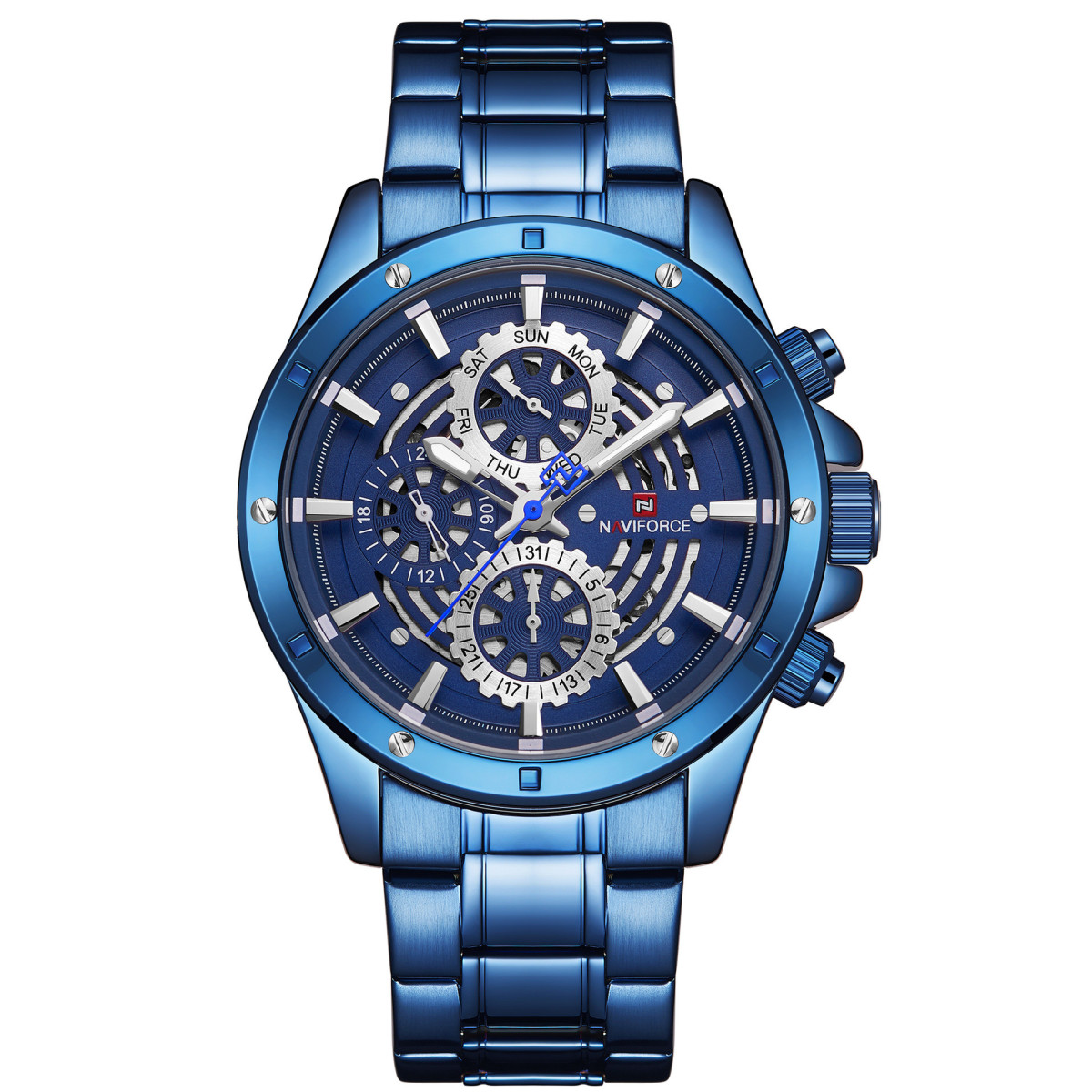 Special functions: calendar, small three hands, 24-hour indication, week display