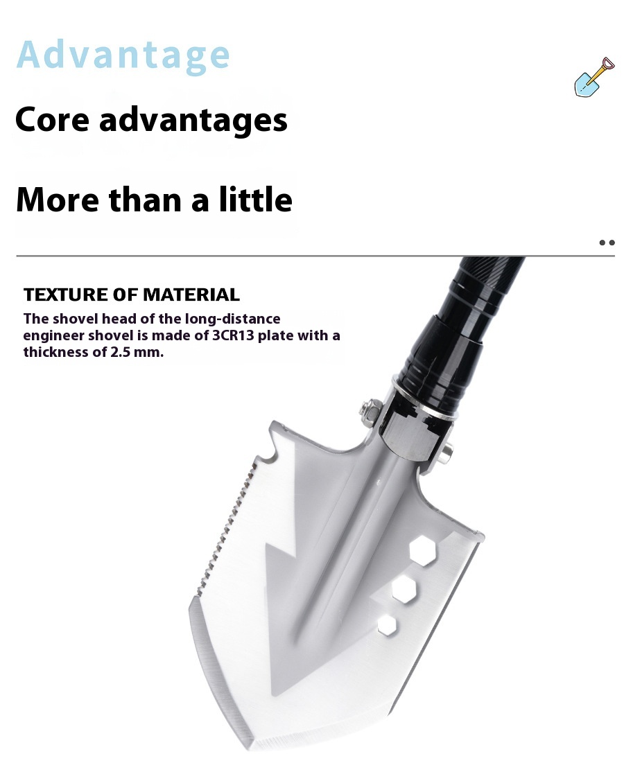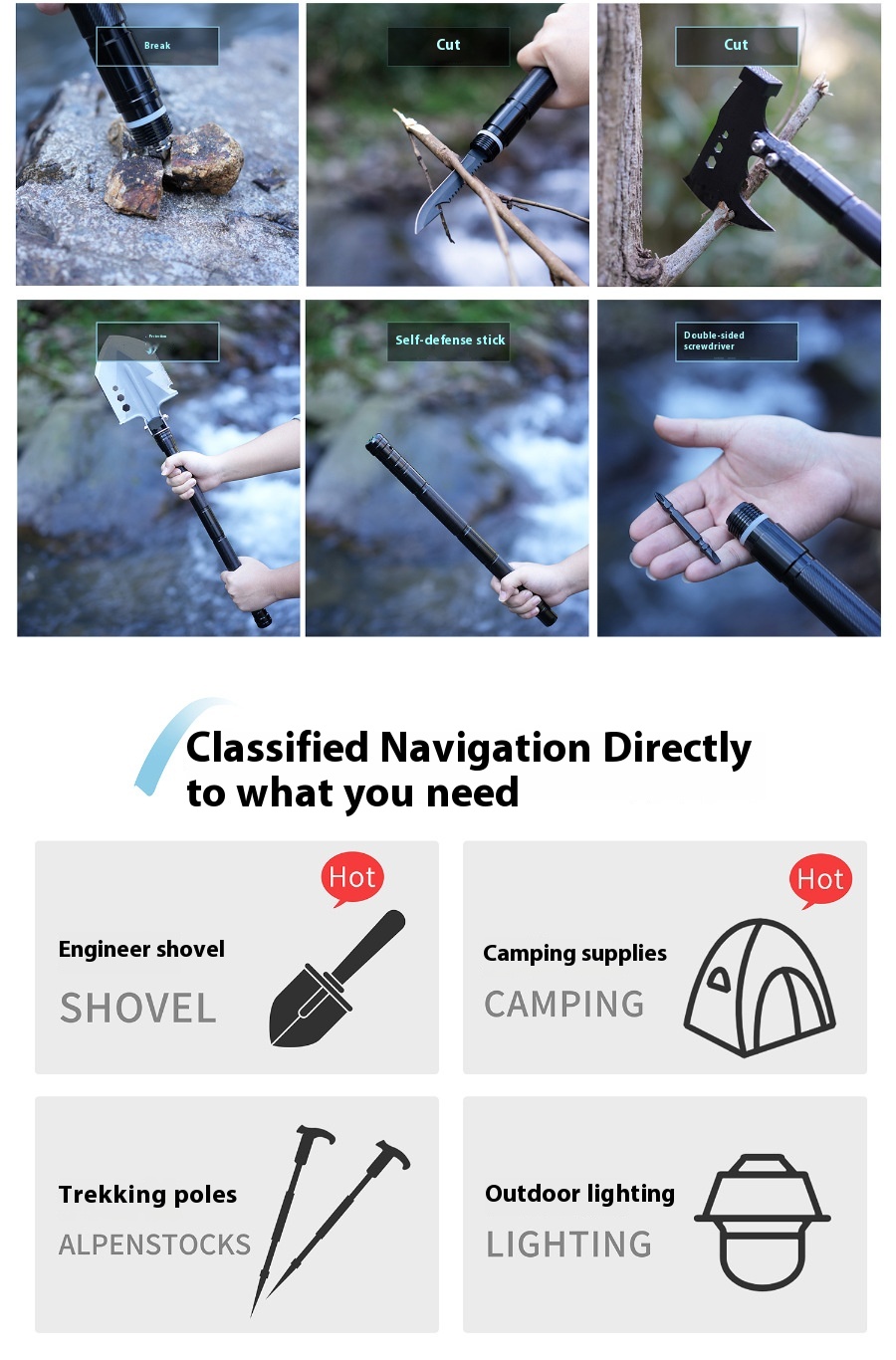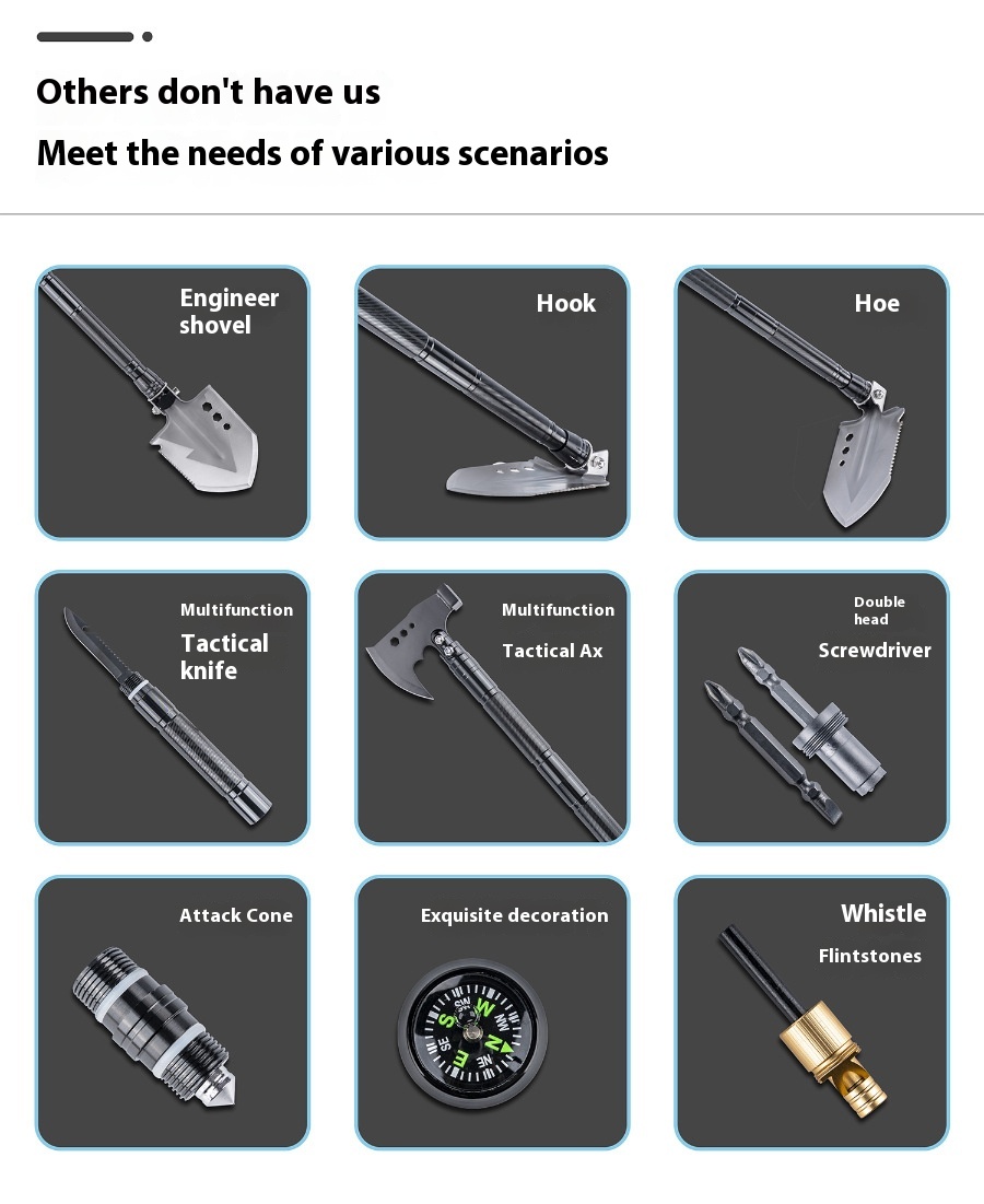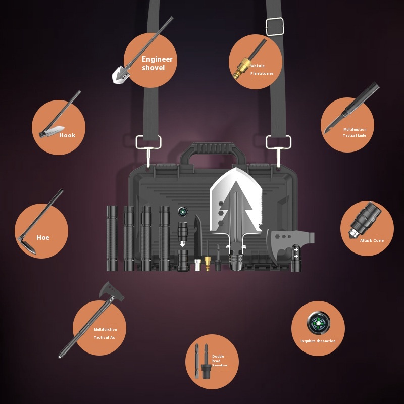 Accessories: shovel head, axe, handle multifunctional knife, attack cone, lighter, whistle, shovel head bag, suitcase