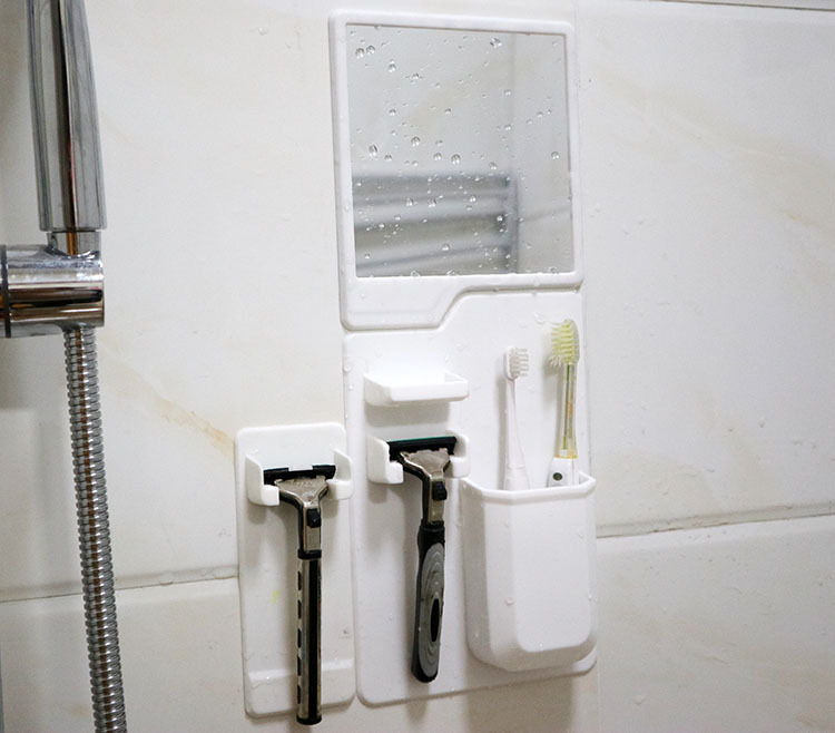 The self-adhesive storage organizer set combines toothbrush holder, shaver and jewelry bowl in one