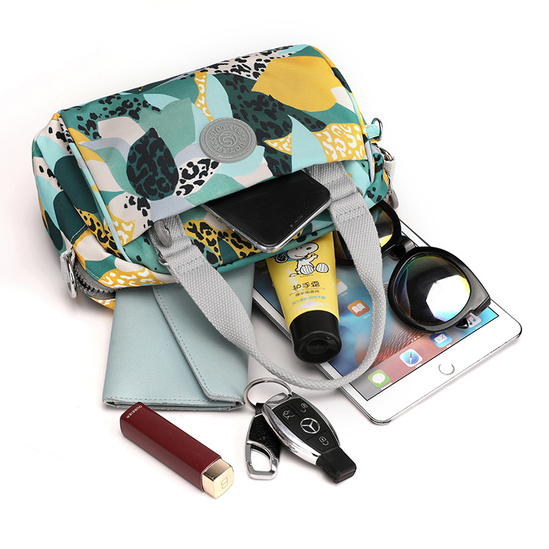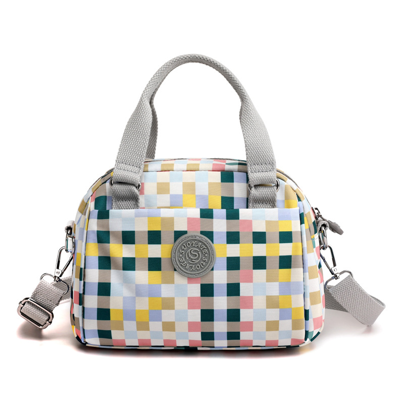 Colors: yellow, black, orange, aqua blue, khaki with lettering, happy flower, pink plaid, blue-and-white floral print