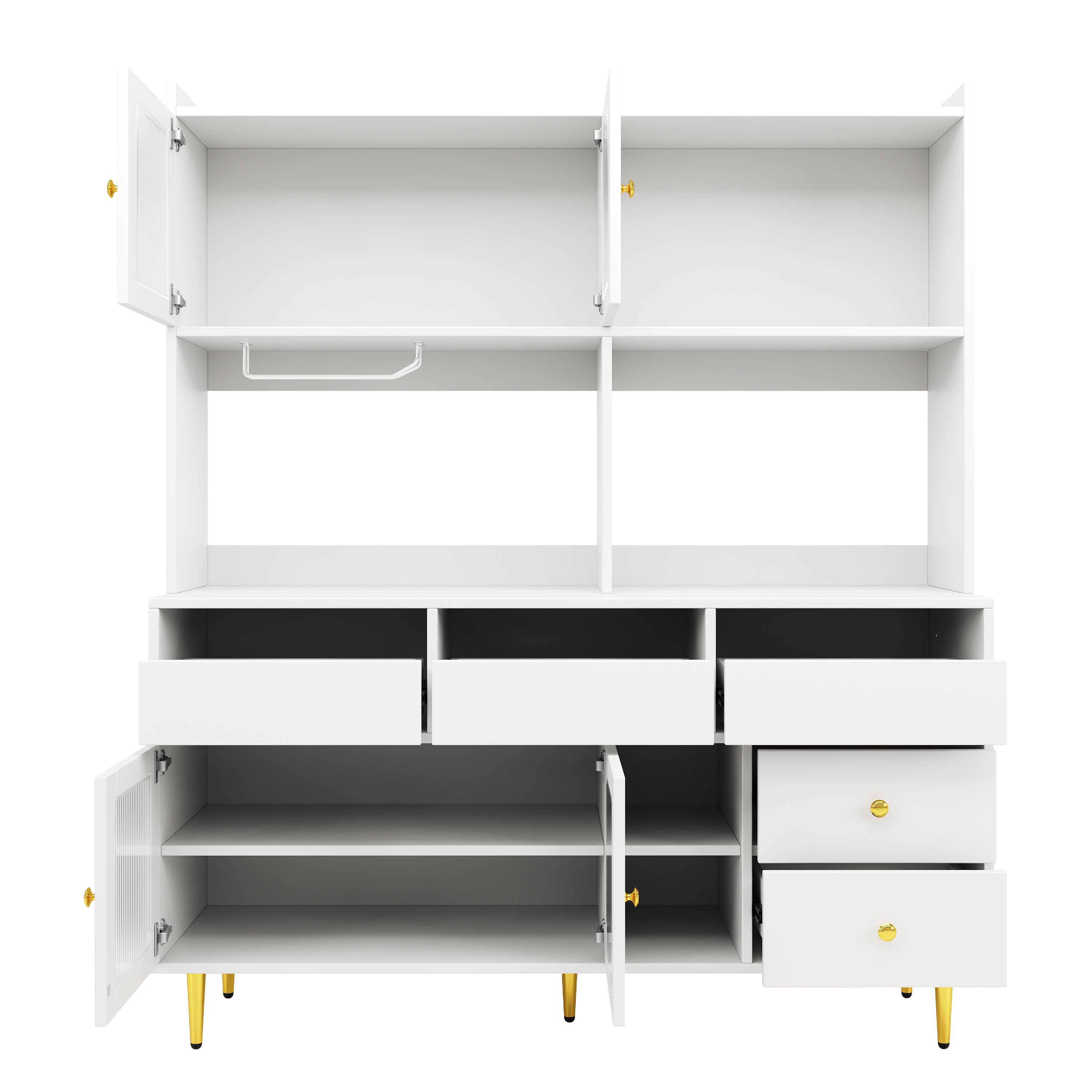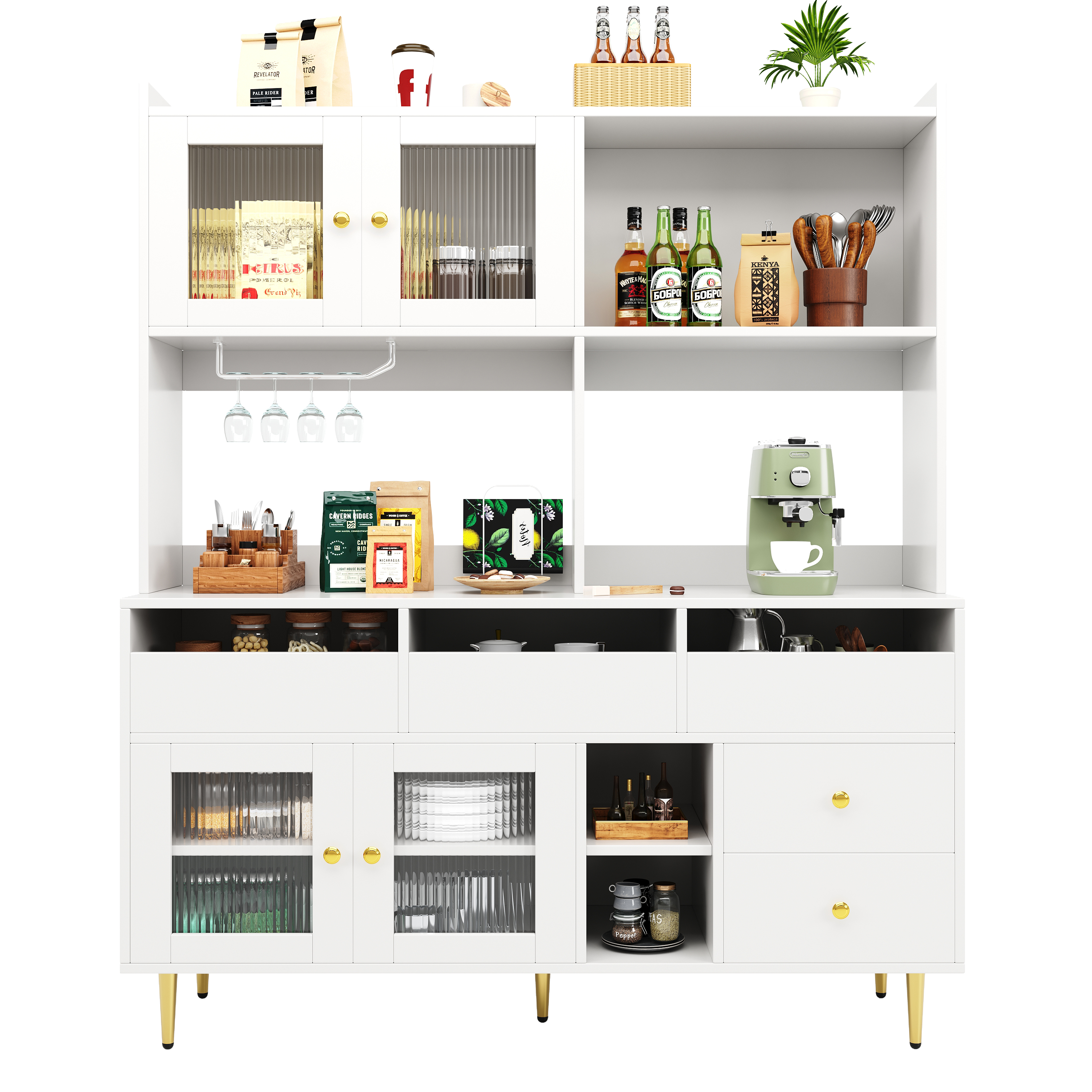 This sideboard not only provides a spacious desk space suitable for placing decorations or daily necessities, but also has extensive storage options, including multiple drawers, wine racks, open storage compartments and multi-layered dividers. Can easily handle different types of storage needs. Whether it's crockery, wine, kitchen utensils or various small items, you'll find the right place to store them. The raised floor design not only makes cleaning easy and convenient, but also provides additional storage flexibility by freeing up floor space. The exquisite metal handles are full of texture and the appropriate design of the cabinet height ensures a comfortable user experience, so that every opening and closing of the cabinet door is smooth and natural, greatly improving the convenience of daily life.