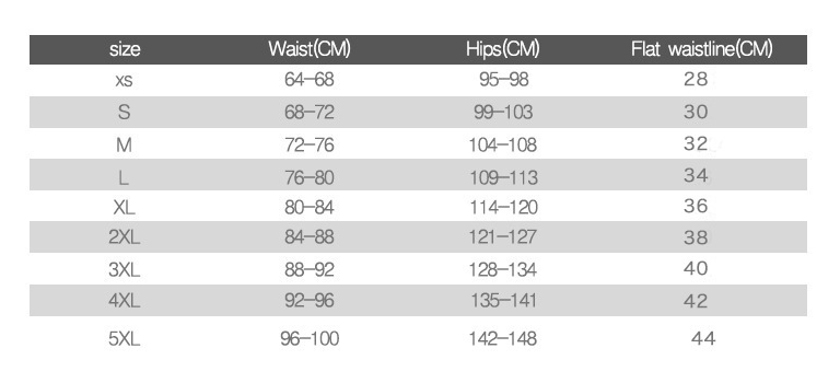 Size: International XS (tile waist circumference 28CM), international S (tile waist circumference 30CM), international M (tile waist circumference 32CM), international L (tile waist circumference 34CM), international XL (tile waist circumference 36CM), international 2XL ( Tile waist circumference 38CM), international 3XL (tile waist circumference 40CM), international 4XL (tile waist circumference 42CM), international 5XL (tile waist circumference 44CM)