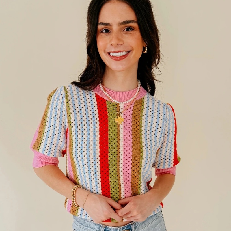 Multicolor Striped Hollow-out Knit Short Sleeve Sweater