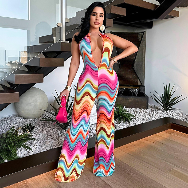 Multicolor Wave Deep V Bare Back High Waist Casual Pants