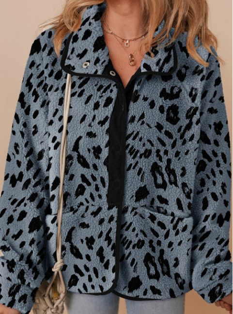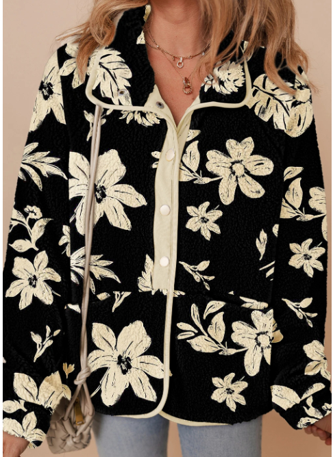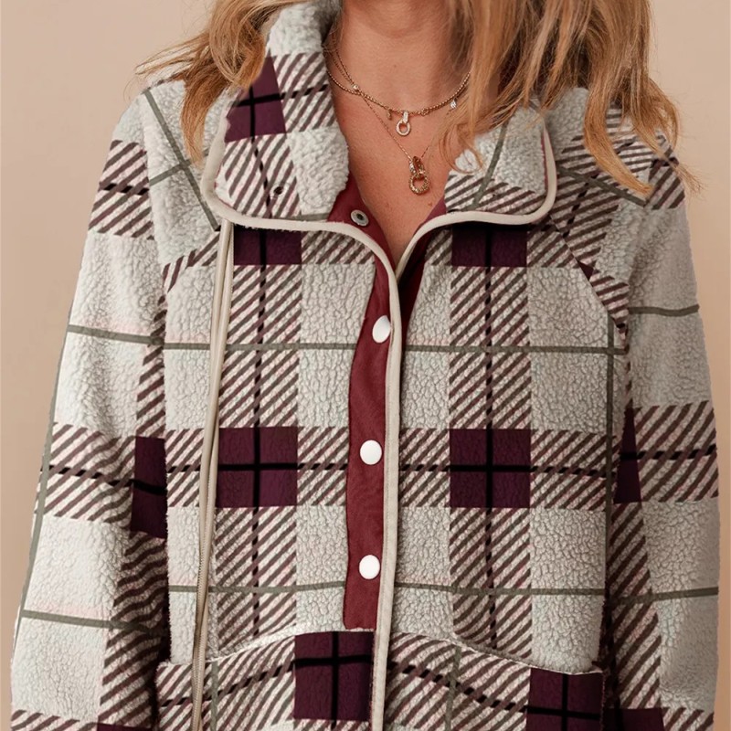 Multicolour Plaid Print Buttoned Stand Collar Fleece Jacket