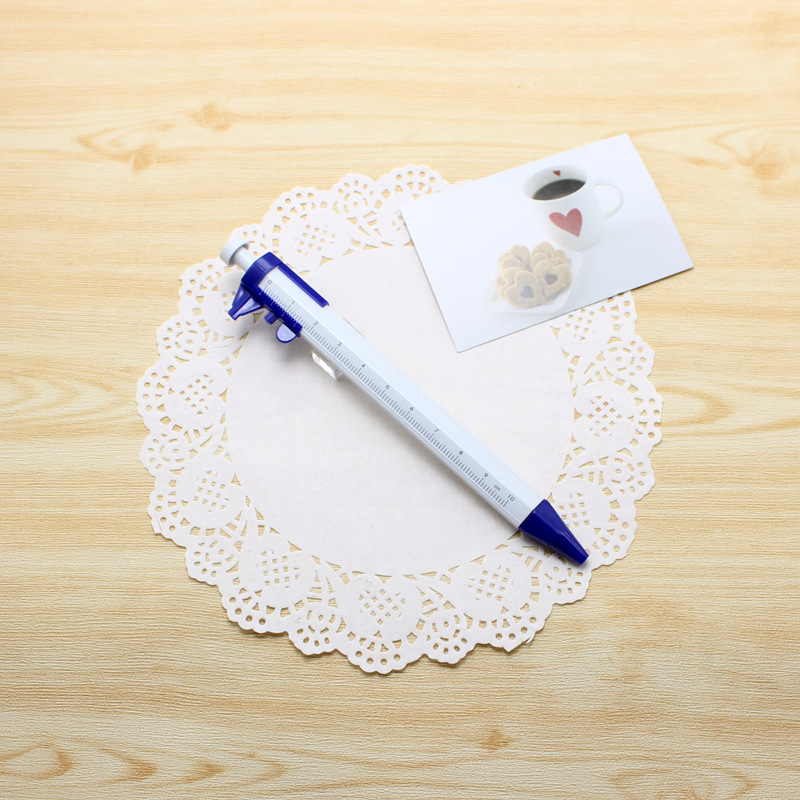 Vernier caliper + ballpoint pen, used for student use.