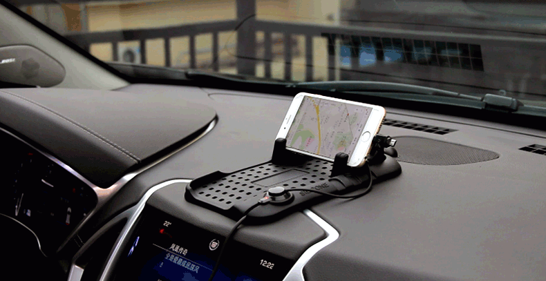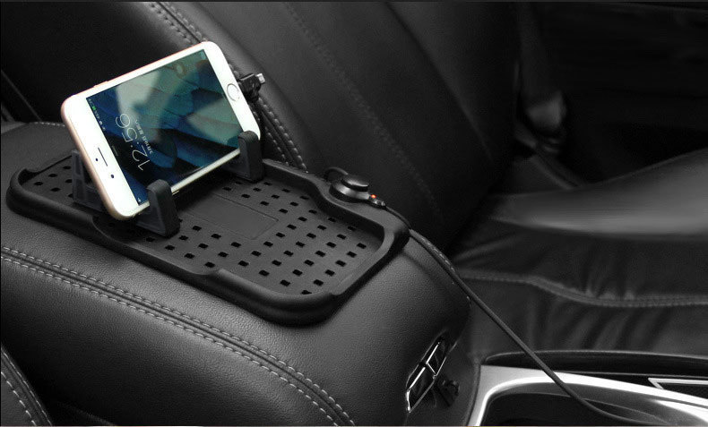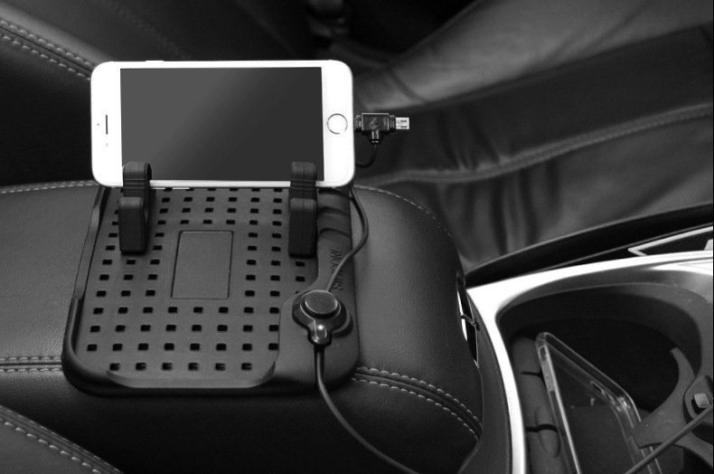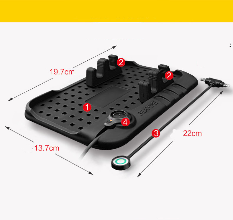 Silicone charging pad bracket for heavy-duty vehicle console, screwless design, easy to install and use. There are many holes in the mat, and you can adjust the position of the bracket as needed.