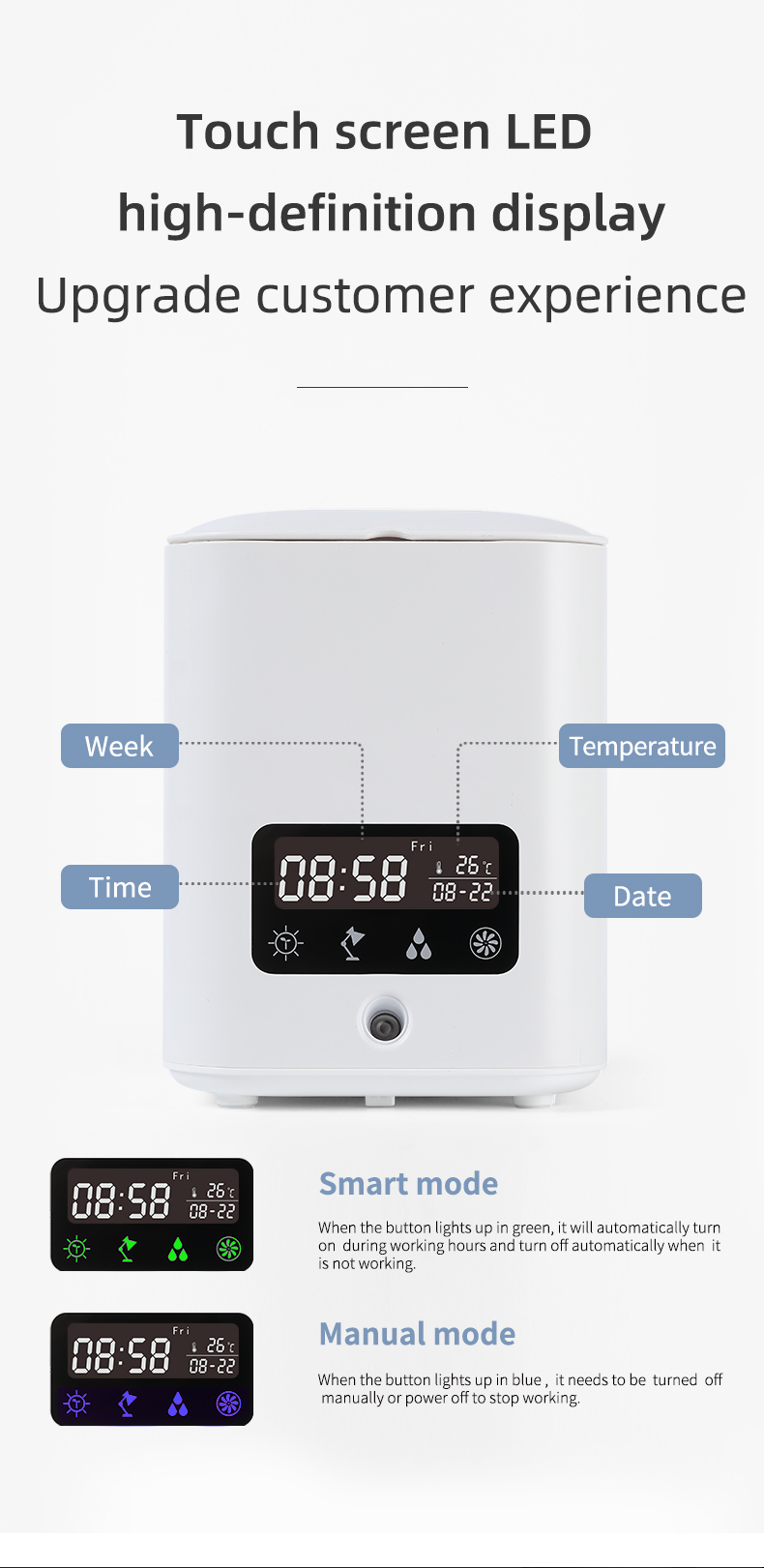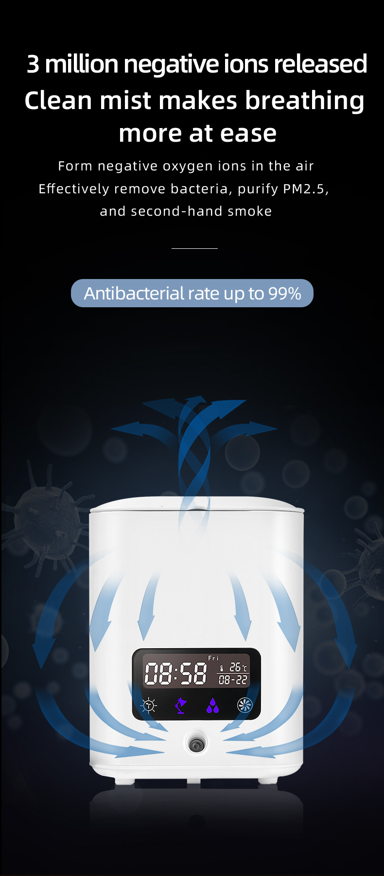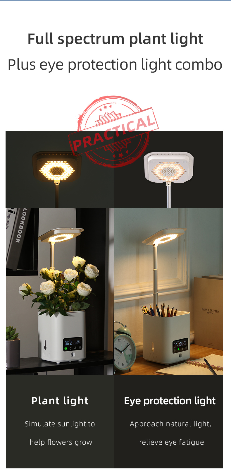 Configuration 2:5 in 1 function: ① humidifier ② air purification ③ Perpetual Calendar screen display ④ eye protection table lamp ⑤ DYI flowerpot
