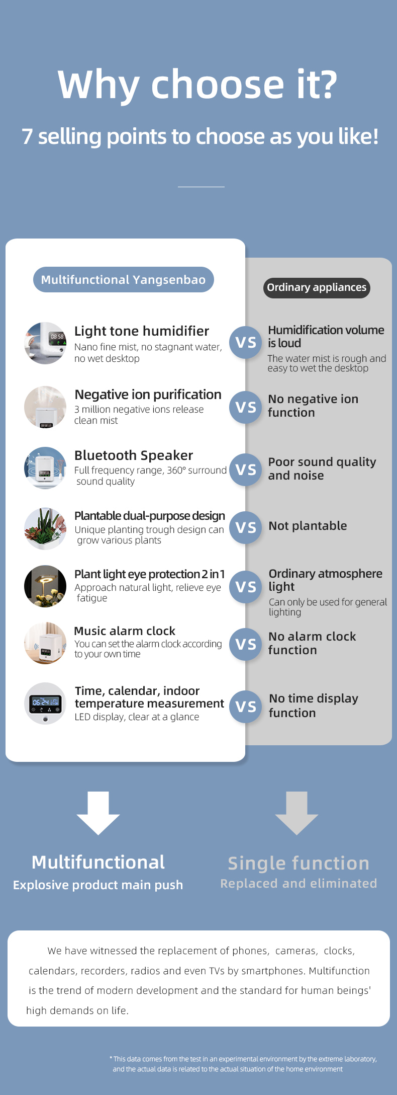 Configuration 1:7 in 1 function: ① humidifier ② air purification ③ Bluetooth audio ④ Perpetual Calendar screen display ⑤ alarm clock function ⑥ eye protection table lamp ⑦ DYI flowerpot