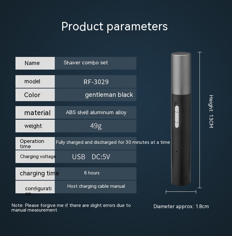 Product information: Power type: USB Color: 3029 Black Cleaning type: washed Motor type: brushless motor Material: ABS Power mode: Electric Hair removal part: whole body Working method: Shaving Cleaning method: removable washing of cutter head