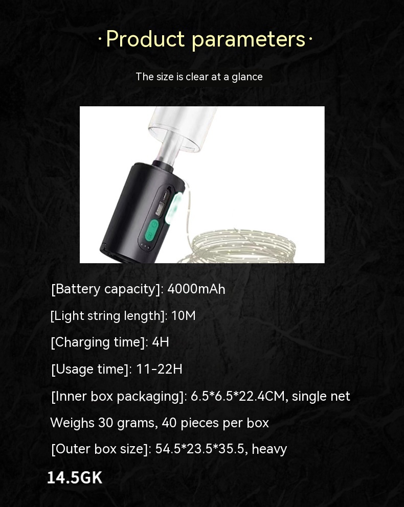 Product information:Color: Warm WhiteBattery capacity: 4000mAhLighting chain length: 10mCharging time: 4HUsage time: 11-22H