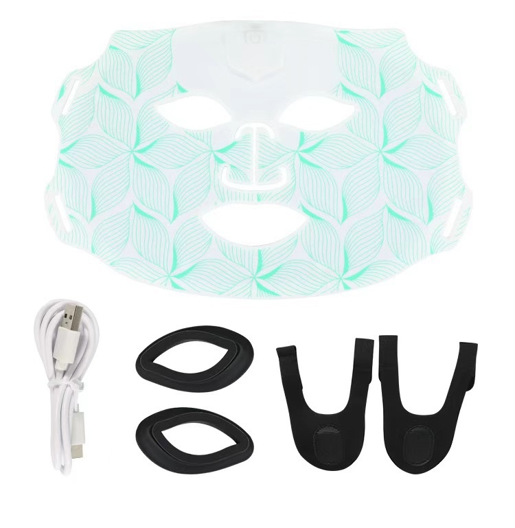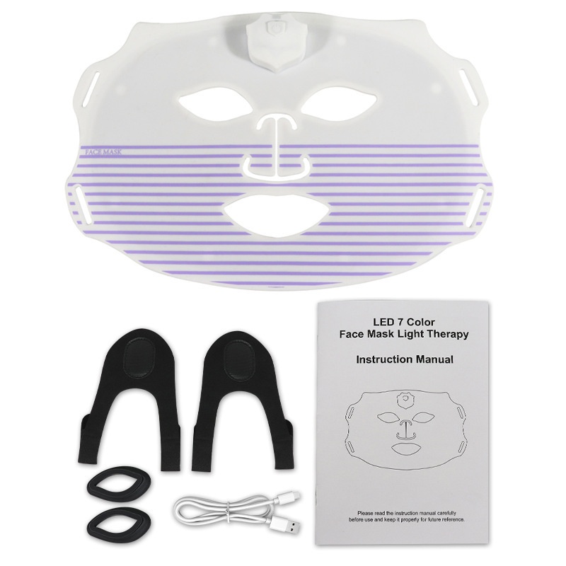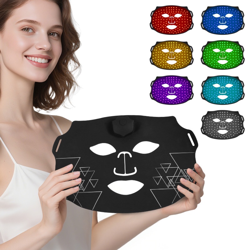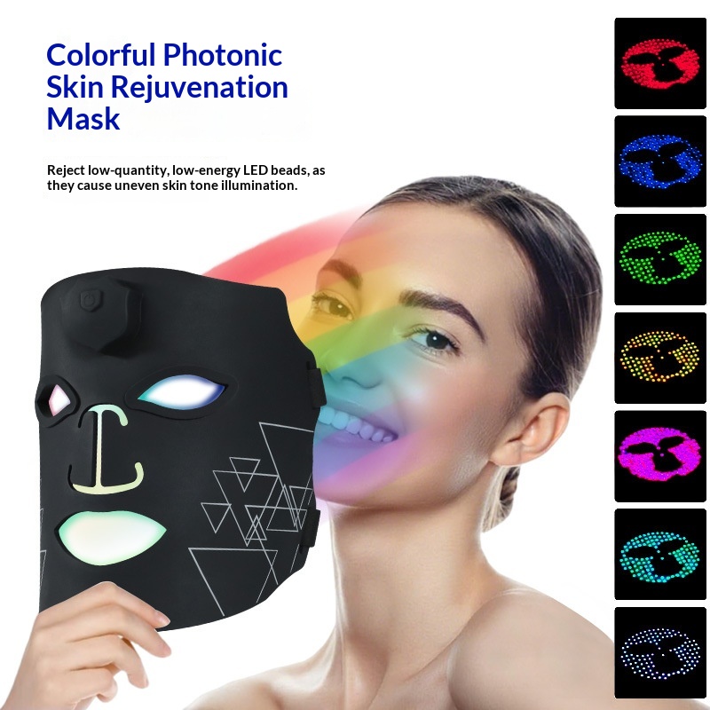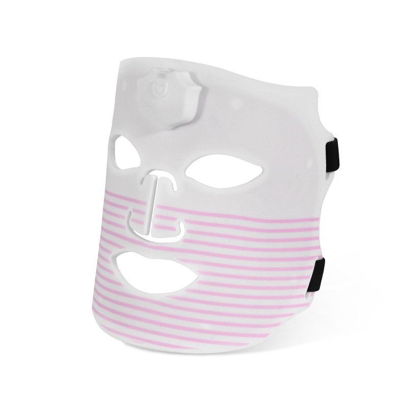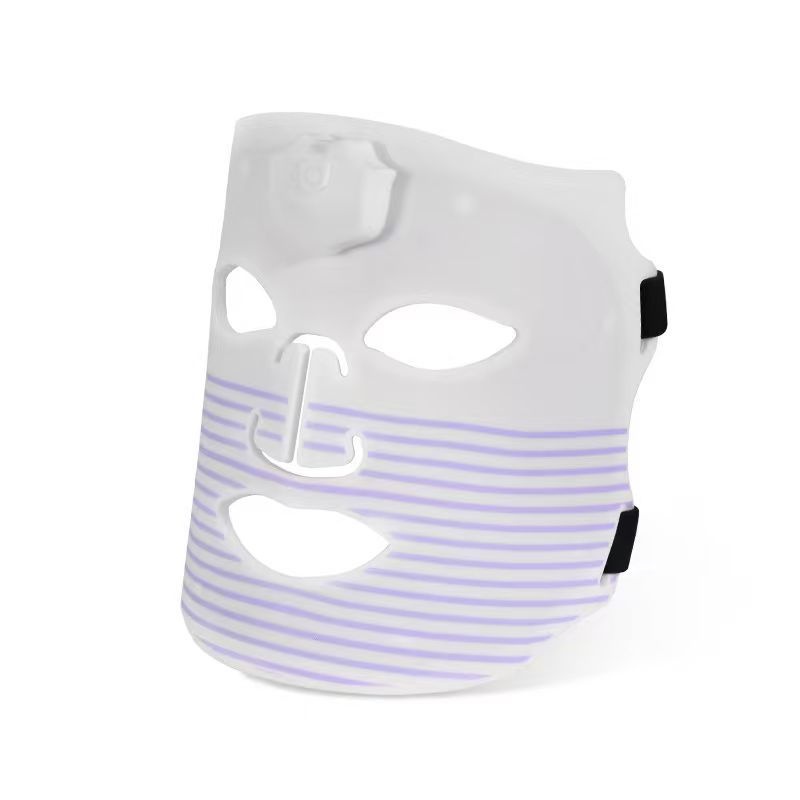 Colors: Photon skin-rejuvenation mask device, iridescent black wave-pattern mask, iridescent white-and-green mask, iridescent white-and-pink striped mask, iridescent white-and-blue striped mask, iridescent white-and-purple striped mask.