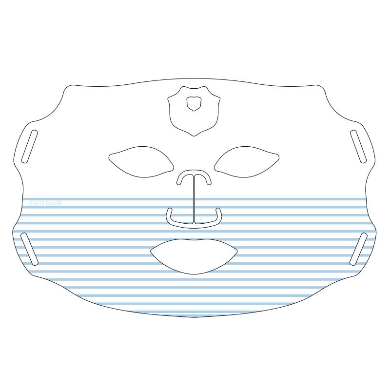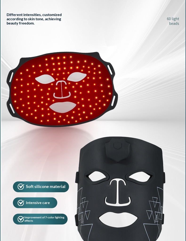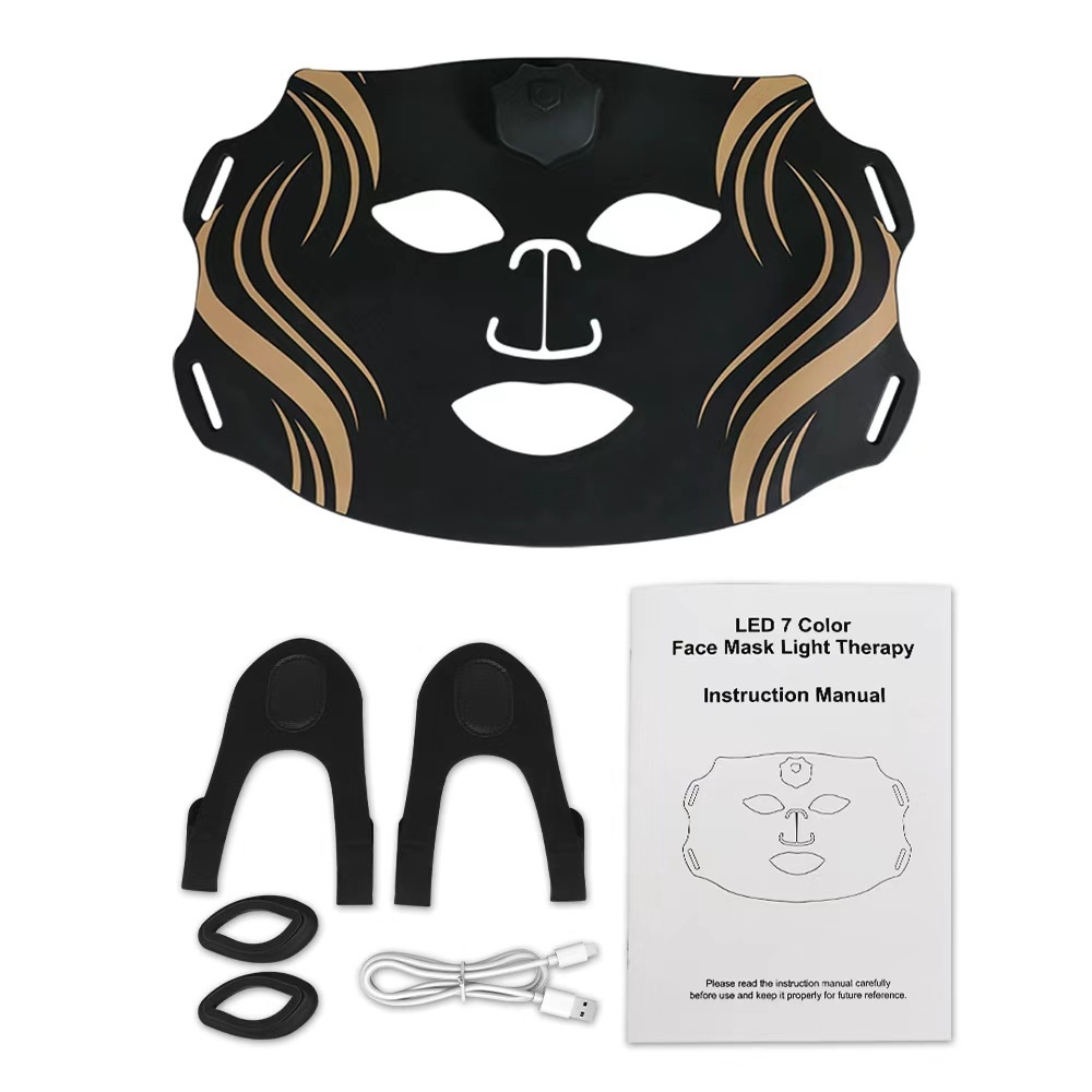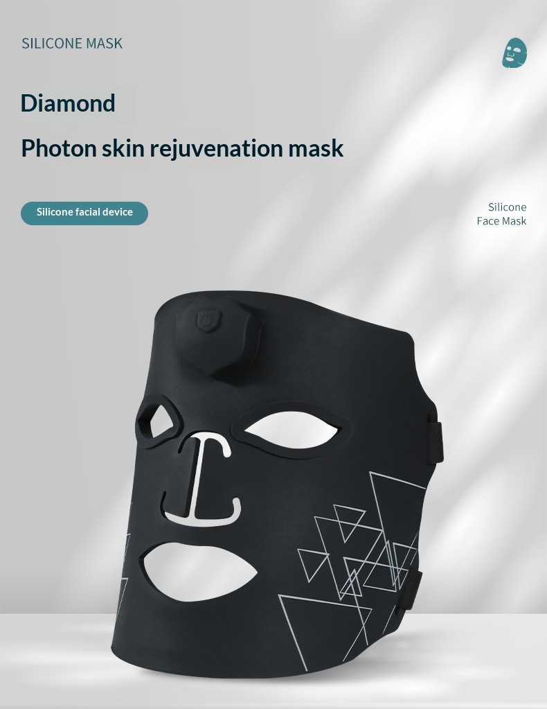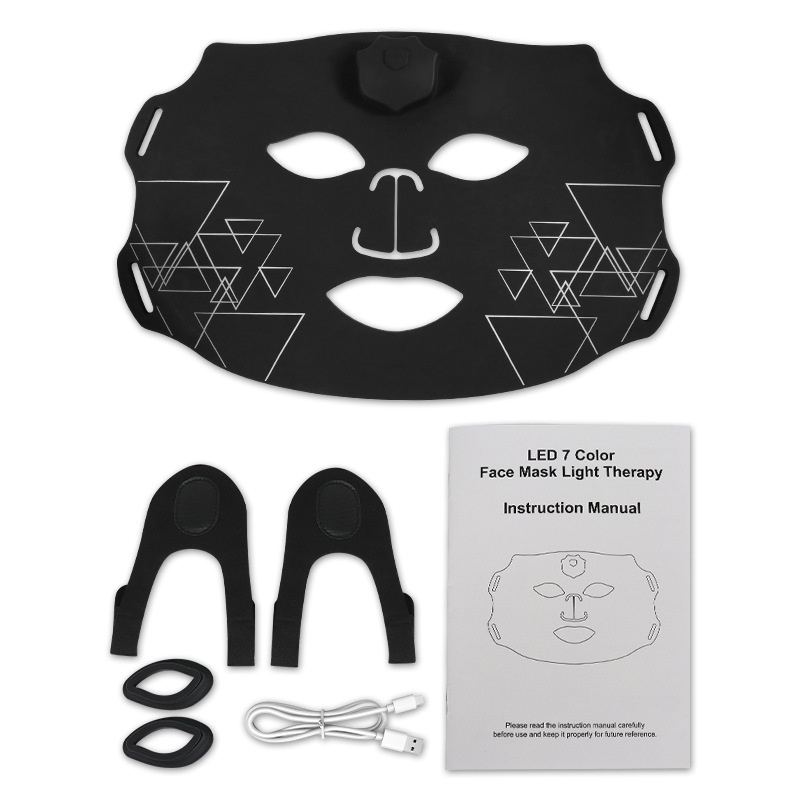 Colors: Photon skin-rejuvenation mask device, iridescent black wave-pattern mask, iridescent white-and-green mask, iridescent white-and-pink striped mask, iridescent white-and-blue striped mask, iridescent white-and-purple striped mask.