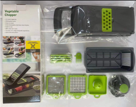 6 blades + 1 vegetable cutter body +- -pc container + 1 hand guard / vegetable cutter body + 6 blades + grinder + hand guard + cleaning brush