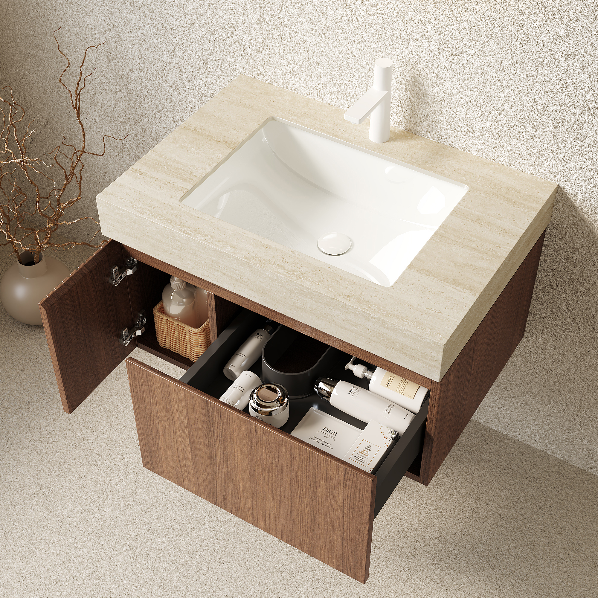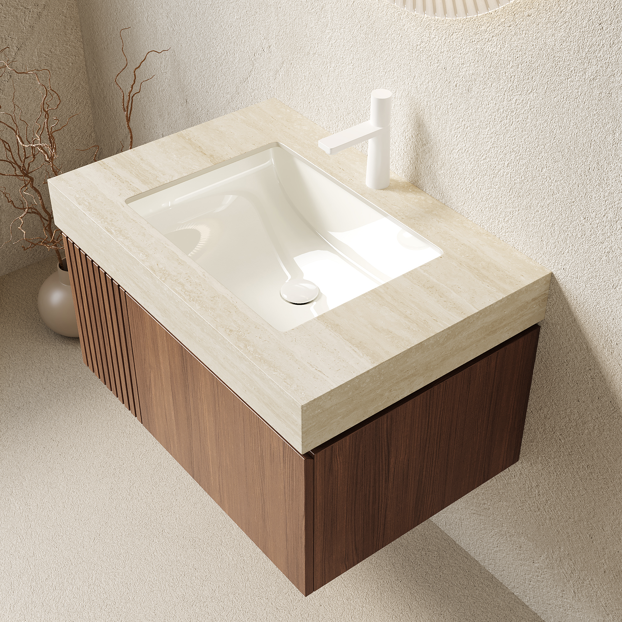 Product Name:MURI 30" Bathroom Vanity&Sink, Floating Plywood Storage Cabinet with Drawer&Door, Roma Travertine Sintered Stone Top&Ceramic Basin with 1 Pre-drilled Faucet Hole, Pre-assembled, Brown Oak Woodgrain