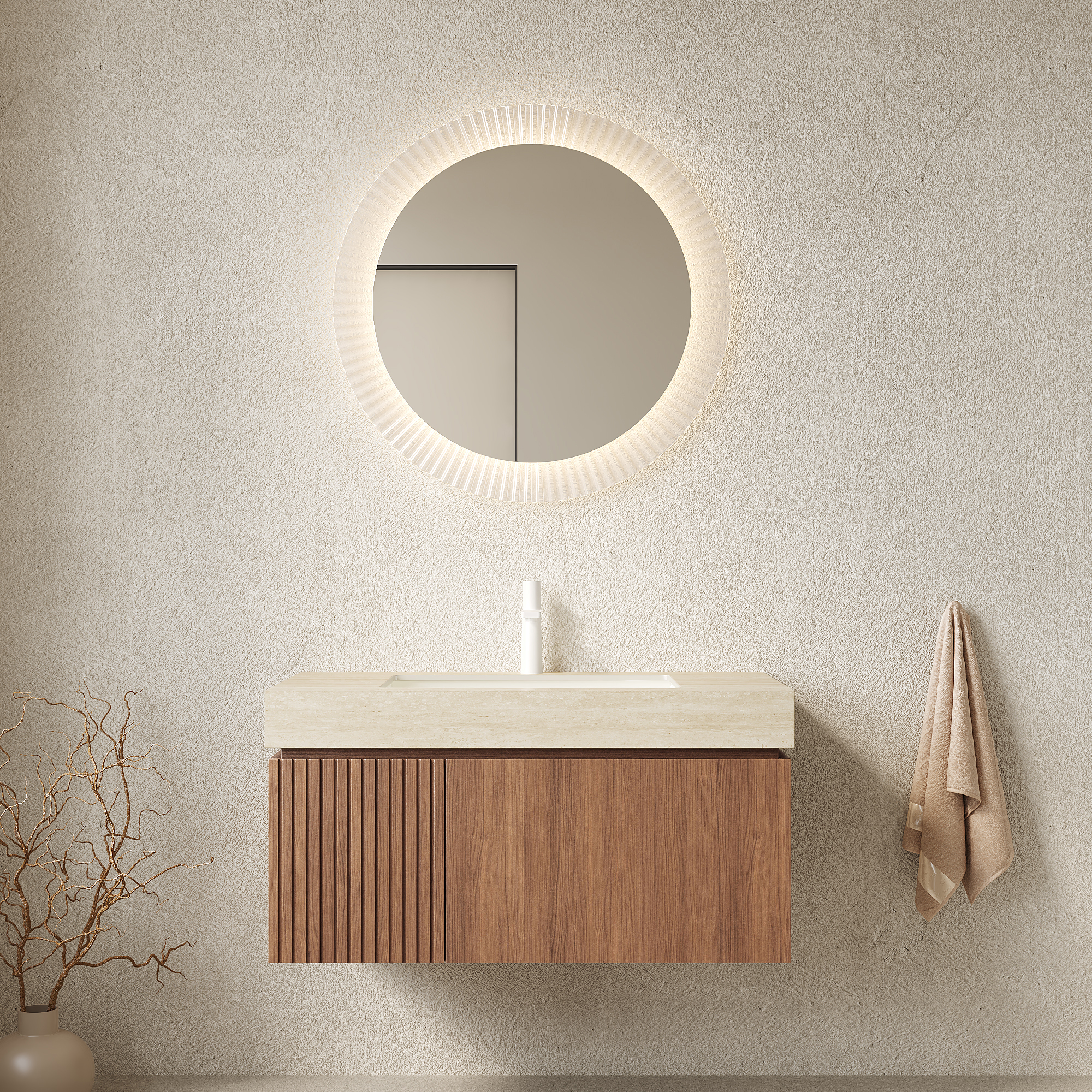 Product Name:MURI 36" Bathroom Vanity&Sink, Floating Plywood Storage Cabinet with Drawer&Door, Roma Travertine Sintered Stone Top&Ceramic Basin with 1 Pre-drilled Faucet Hole, Pre-assembled, Brown Oak Woodgrain