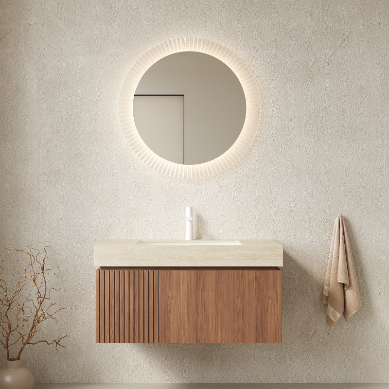 The door on the right is made of waterproof and paint-free wood panels, with clear and delicate wood grain texture, smooth and wear-resistant. The drawer panel on the left is made of the whole oak wood veneer, then made of concave and convex stripes on it to let the whole cabinet has artistic characteristics. The cabinet is made of plywood, which is harder and more durable than MDF. It also has excellent water and moisture resistance to ensure that not easy to be deformed or moldy even in a humid bathroom environment. *Please noted that the panel may have different color and grain pattern under the different light.