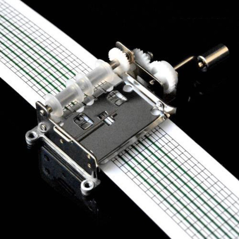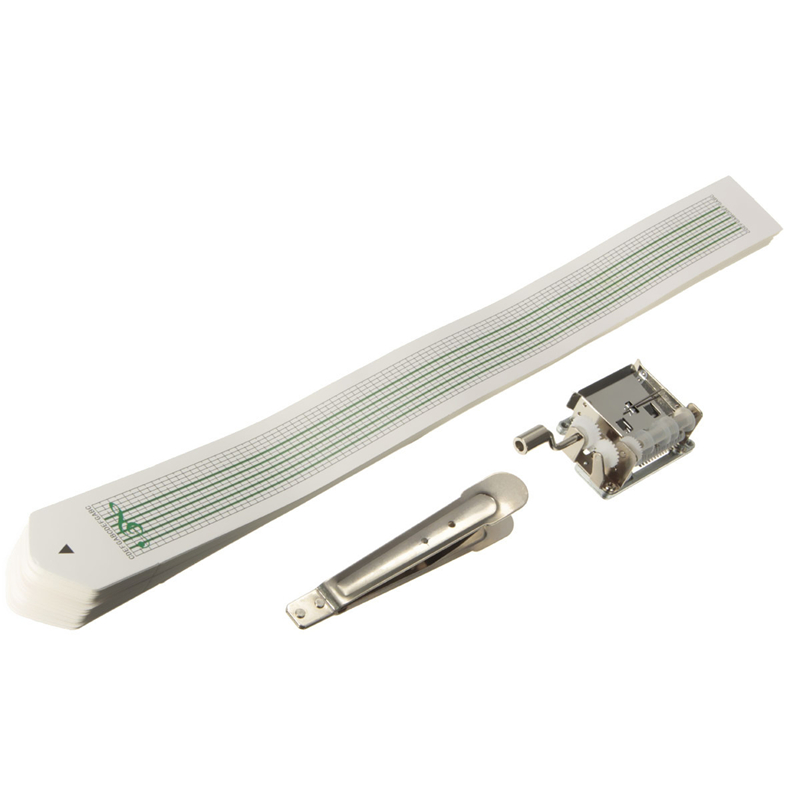 On the paper label below the note, then use the punch. Then put it on the music box, turn the handle, and you can make a sound.