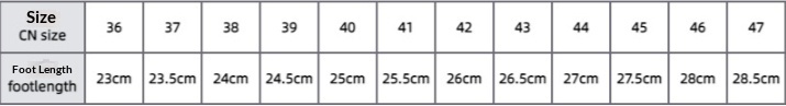 Sizes: 36 – Foot Length 23cm, 37 – Foot Length 23.5cm, 38 – Foot Length 24cm, 39 – Foot Length 24.5cm, 40 – Foot Length 25cm, 41 – Foot Length 25.5cm, 42 – Foot Length 26cm, 43 – Foot Length 26.5cm, 44 – Foot Length 27cm, 45 – Foot Length 27.5cm, 46 – Foot Length 28cm, 47 – Foot Length 28.5cm