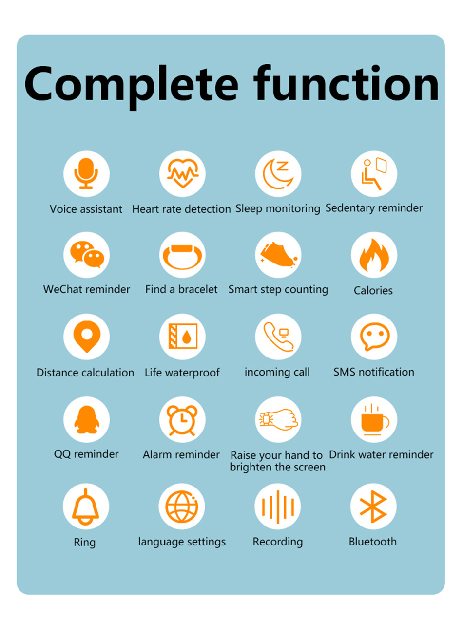 7 Other functions: mute alarm clock, remote camera, music control, incoming call ringtone, recording, voice assistant, etc.