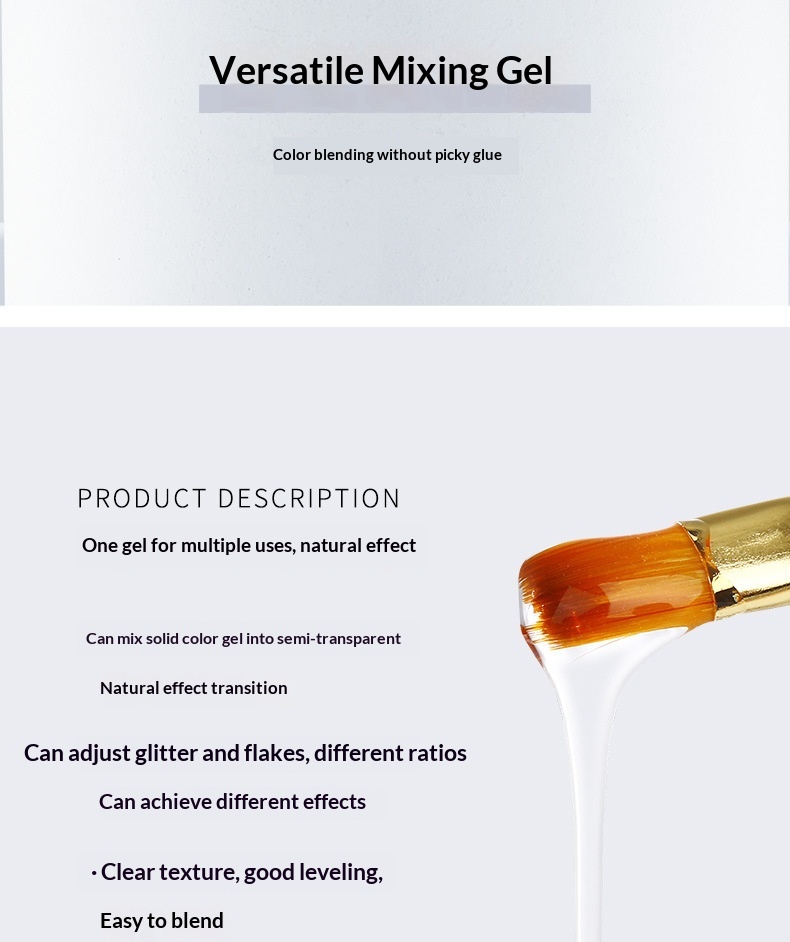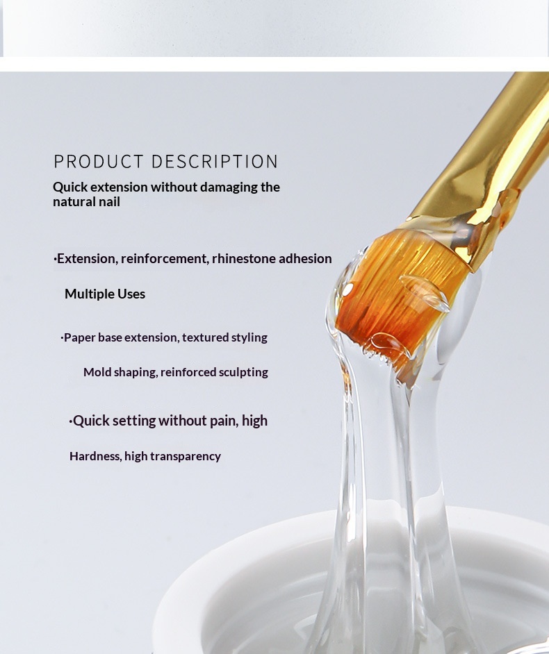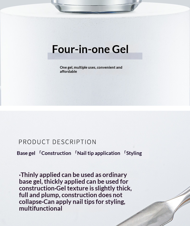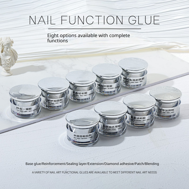 Colors: Versatile blending gel, jelly no-wipe rhinestone adhesive gel (semi-solid rhinestone glue), crystal extension gel, 4-in-1 gel, 3D solid gel, crystal sealing gel, hard sealing gel, nail strengthening and protection gel, multi-purpose construction gel, solid tip adhesive, glass sealing gel.