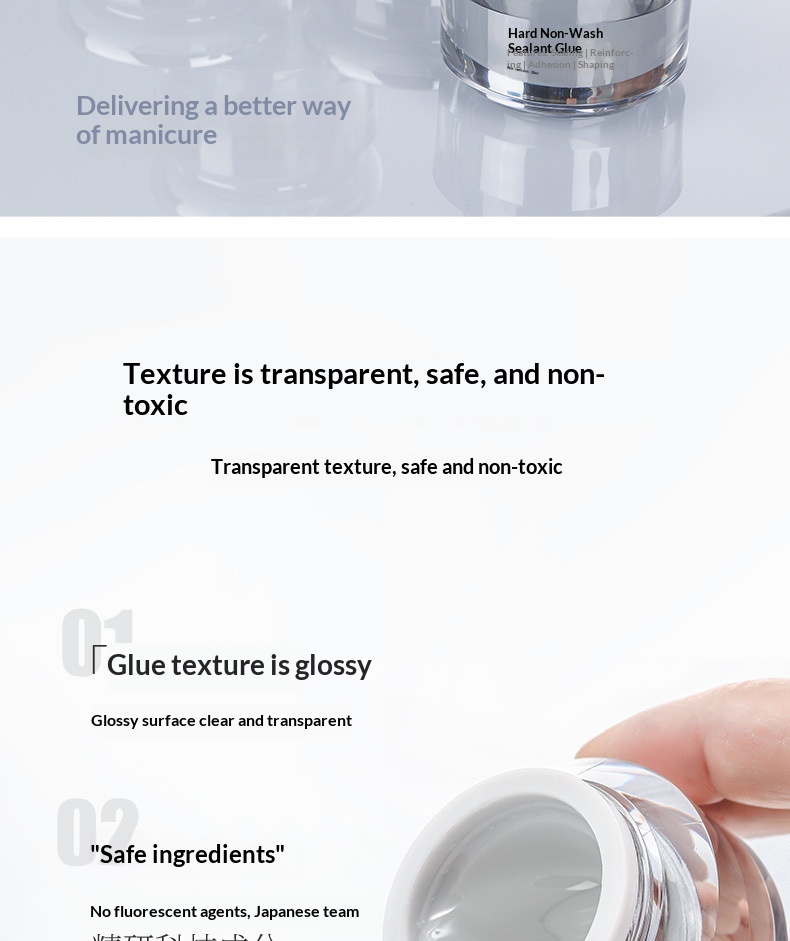Functions: No-wipe, shaping, extension, sealing, blending, strengthening, rhinestone adhesion