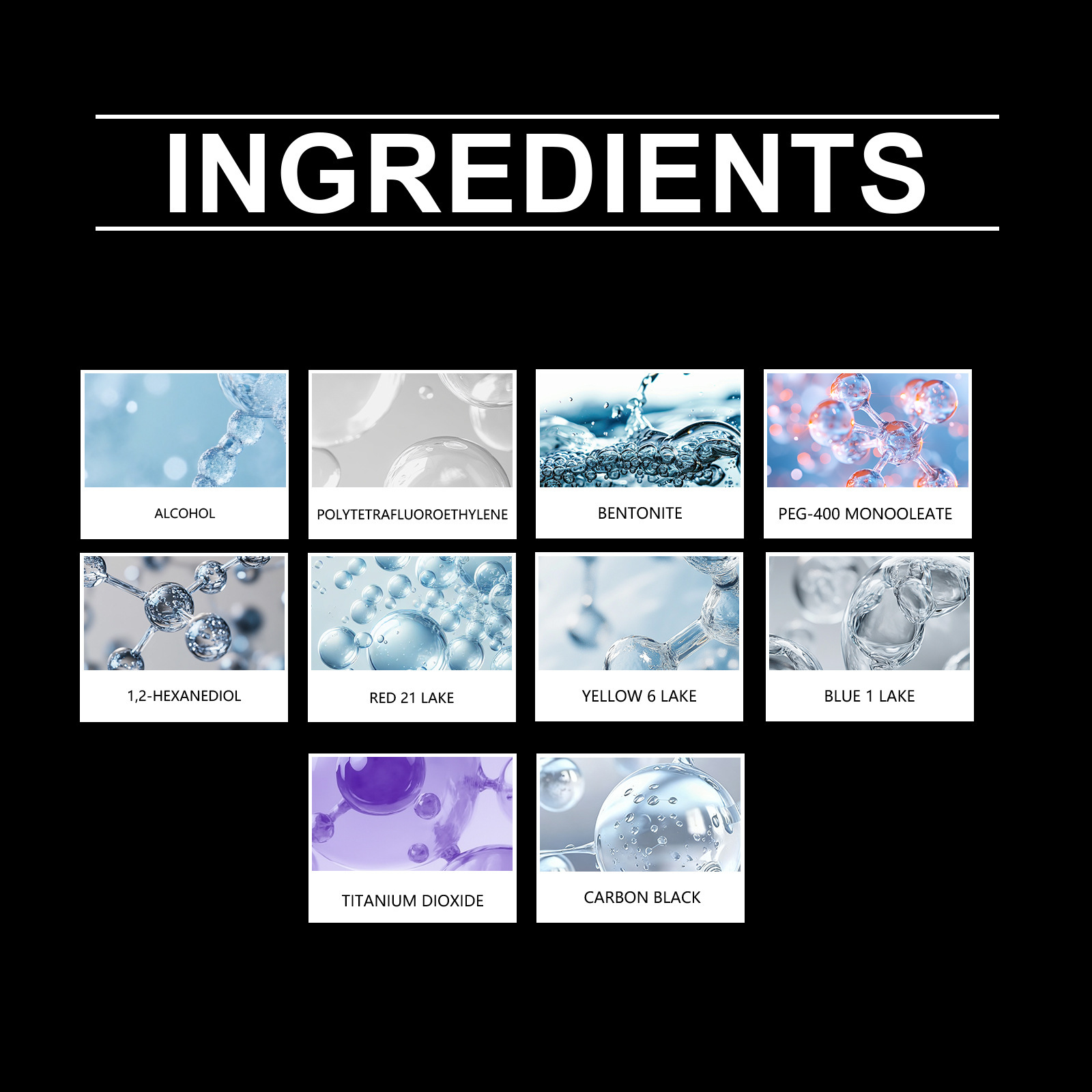 Ingredients: Ethanol, fluorocarbon resin, bentonite, polyethylene glycol, oleic acid ester, 1,2-hexanediol, Red Lake No. 21, Yellow Lake No. 6, Blue Lake No. 1, titanium dioxide, carbon black