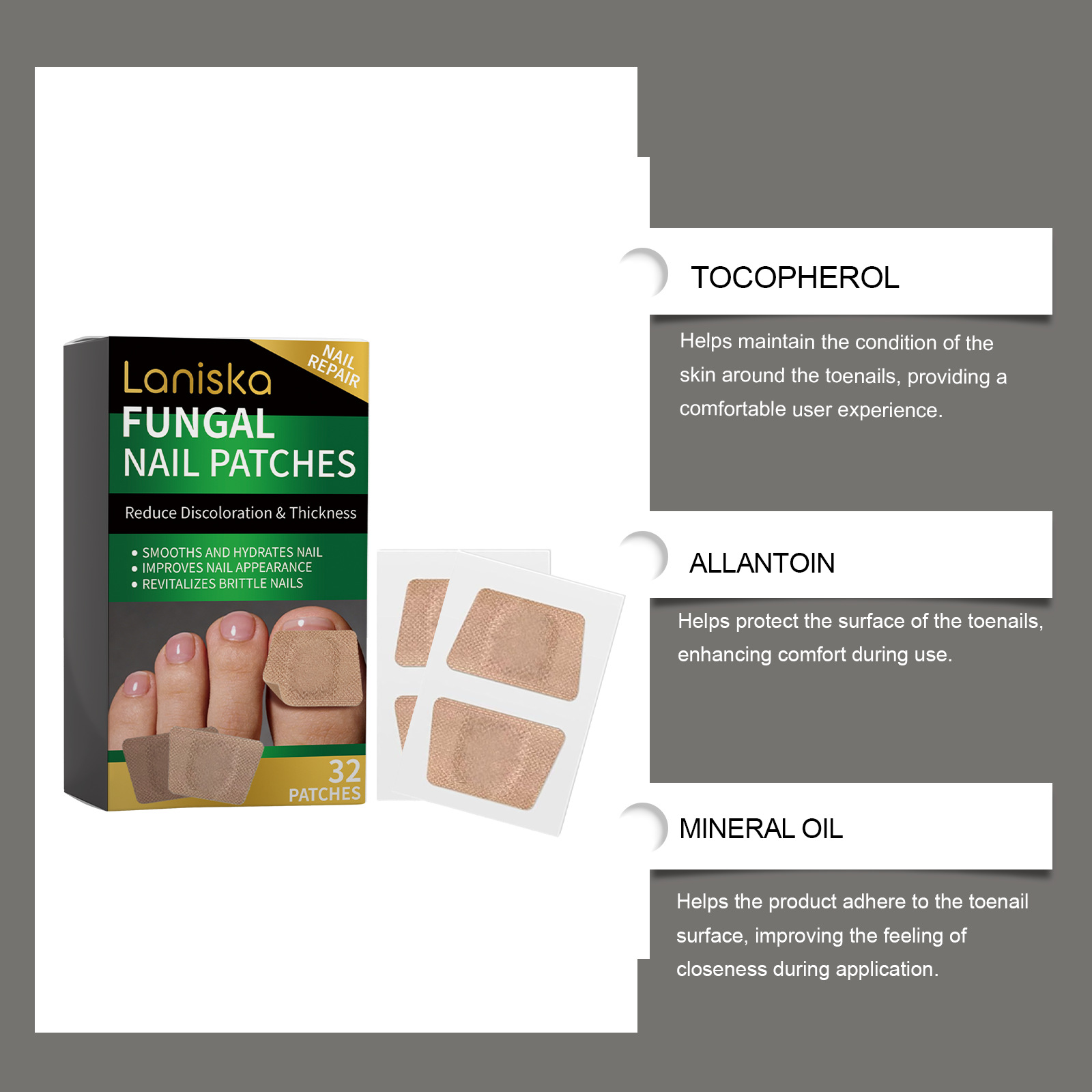 Ingredients: Active ingredients: tocopherol (vitamin E), allantoin, garlic bulb extract, Kochia scoparia fruit extract, snake bed fruit extract and tea oil.