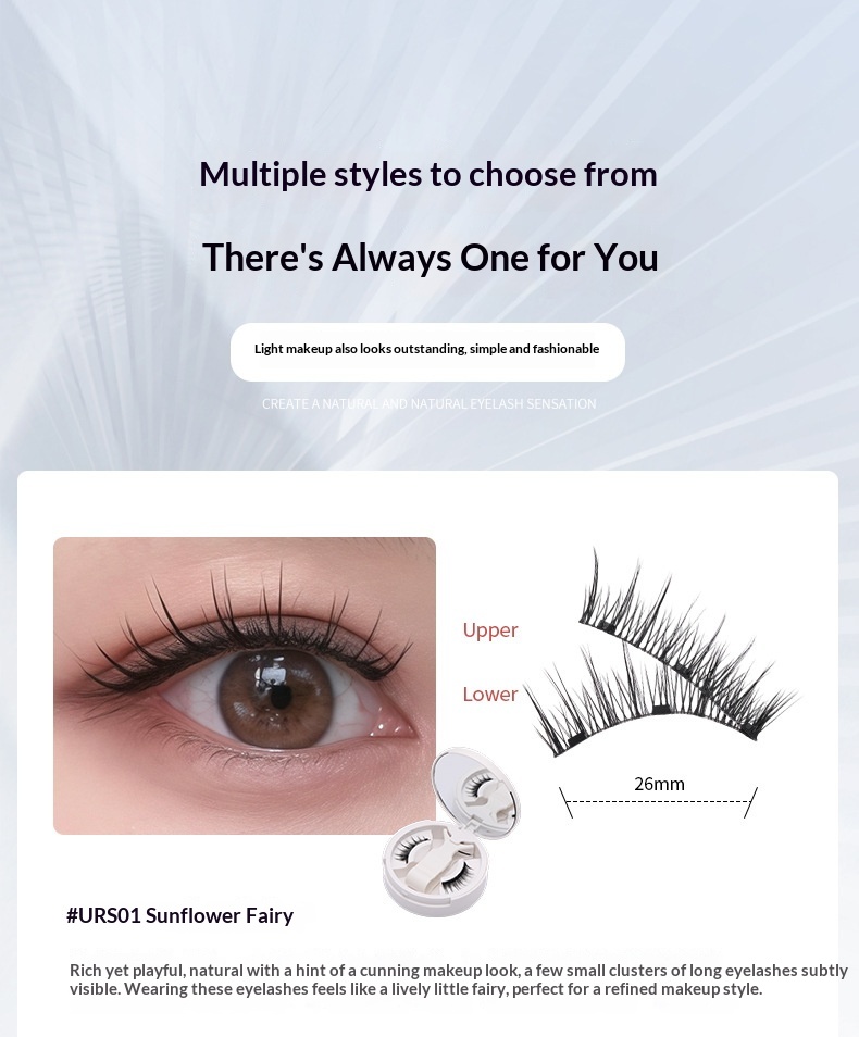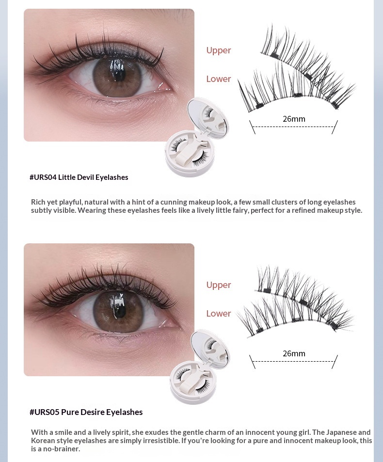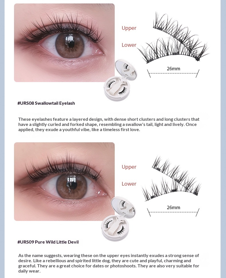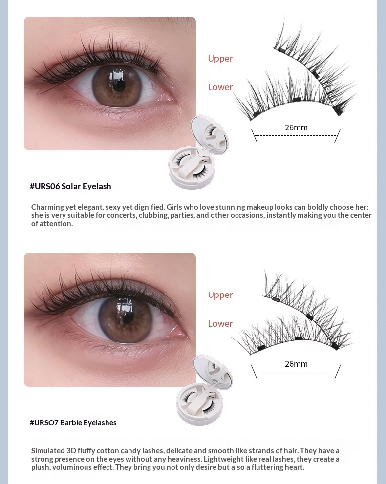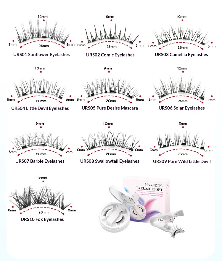 Specifications: URS01 Sunflower Lashes (white), URS01 Sunflower Lashes (pink), URS02 Cartoon Lashes (white), URS02 Cartoon Lashes (pink), URS03 Camellia Lashes (white), URS03 Camellia Lashes (pink), URS04 Little Devil Lashes (white), URS04 Little Devil Lashes (pink), URS05 Pure & Alluring Lashes (white), URS05 Pure Lashes & Alluring Lashes (pink), URS06 Sun Lashes (white), URS06 Sun Lashes (pink), URS07 Barbie Lashes (white), URS07 Barbie Lashes (pink), URS08 Swallowtail Lashes (white), URS08 Swallowtail Lashes (pink), URS09 Pure Wild Little Devil (white), URS09 Pure Wild Little Devil (pink), URS10 Fox-Tone Lashes (white), URS10 Fox-Tone Lashes (pink)