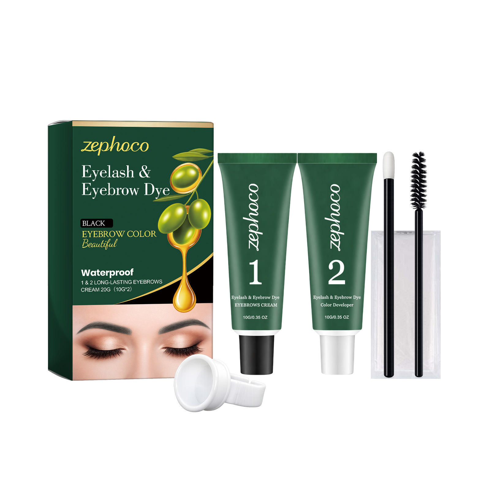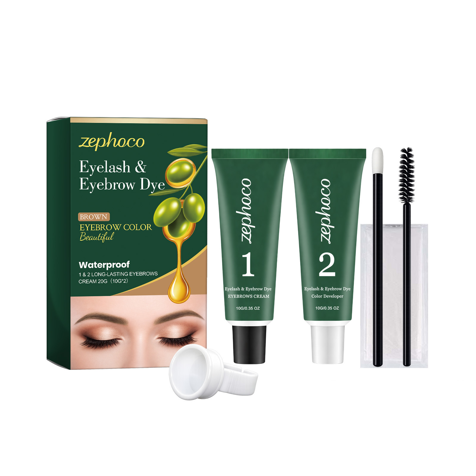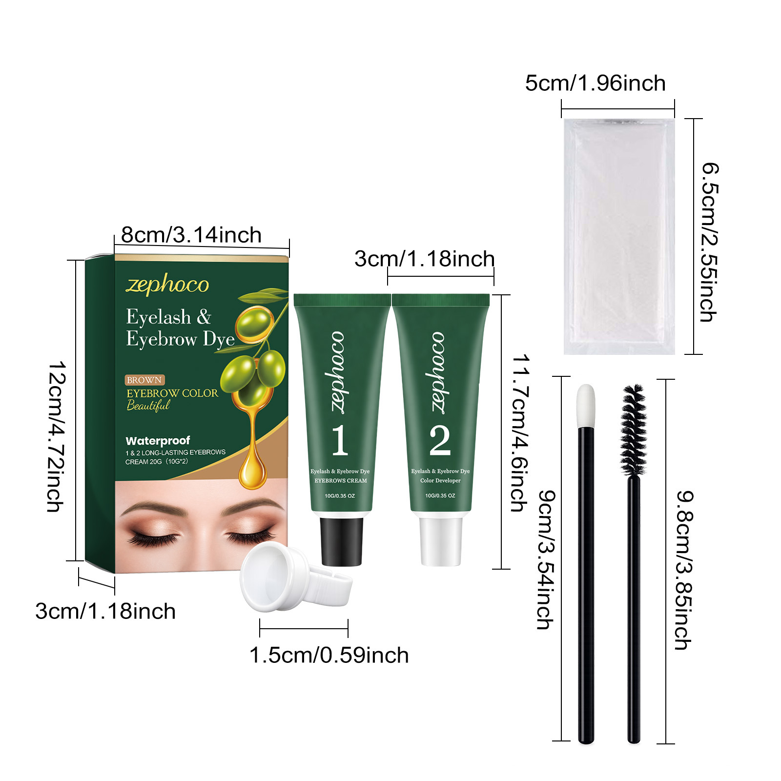 Net Content: Eyebrow Gel 10 g × 1, Developer Solution 10 g × 1, Eyebrow Brush × 1, Mascara Brush × 1, Pair of Disposable Gloves × 1, Ring-shaped Paint Cup × 1