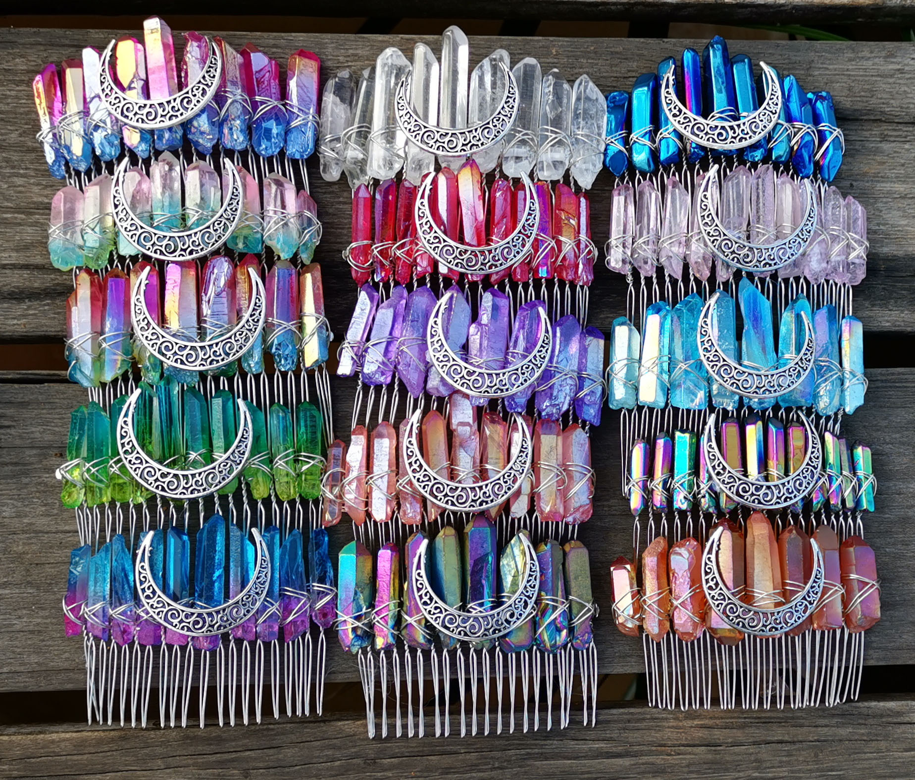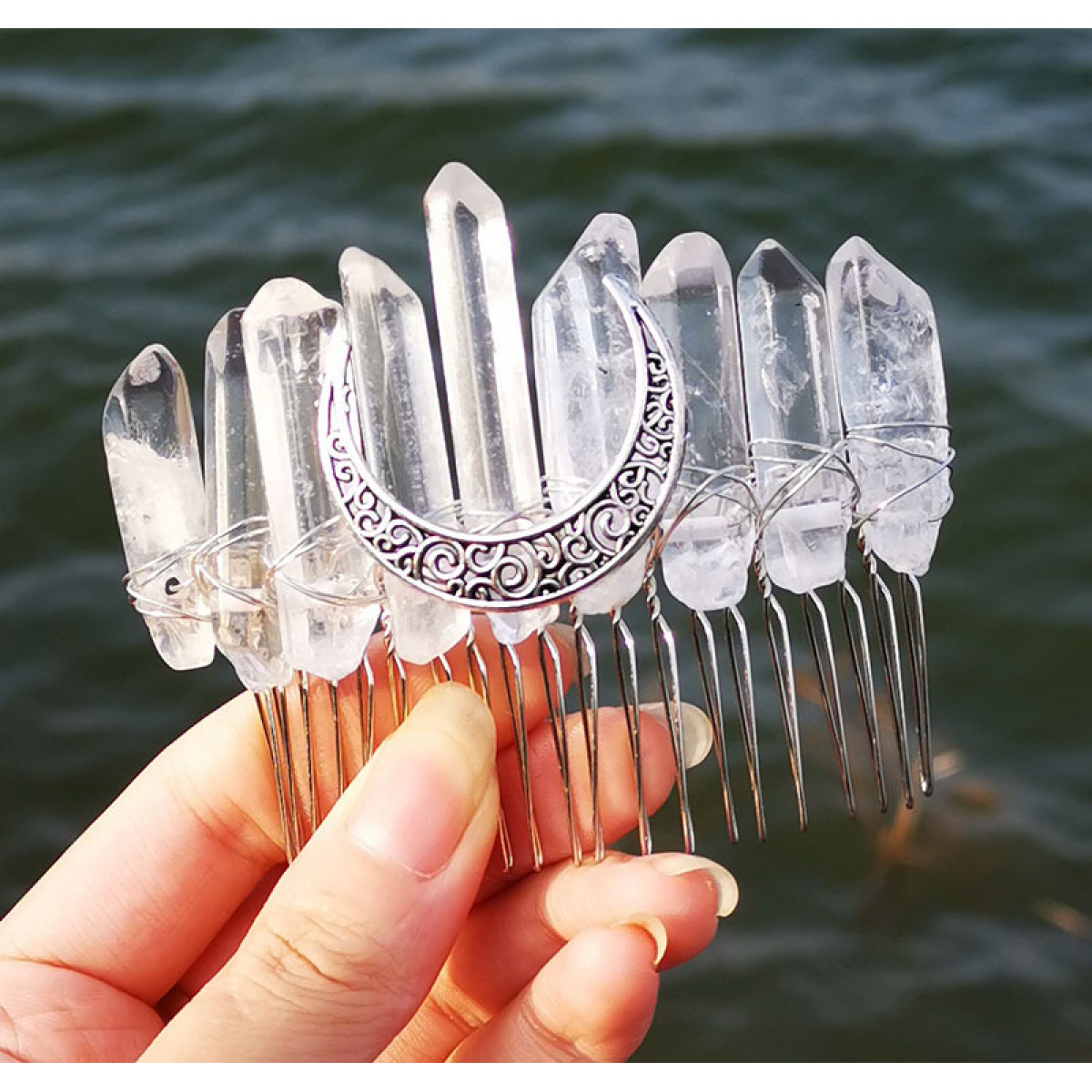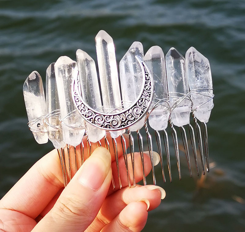 Natural Crystal Rainbow Red Sky Blue Bridal Silver Thread 20 Teeth Hair Comb