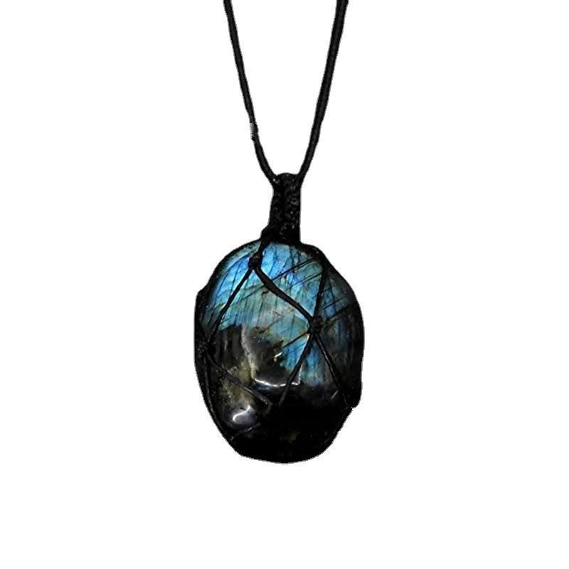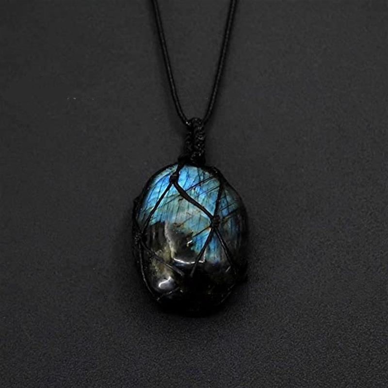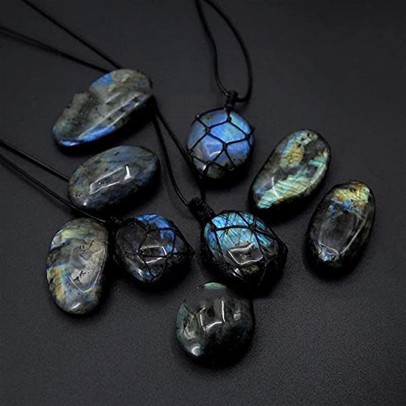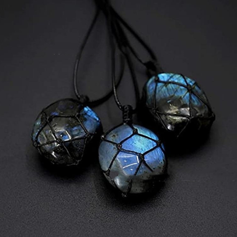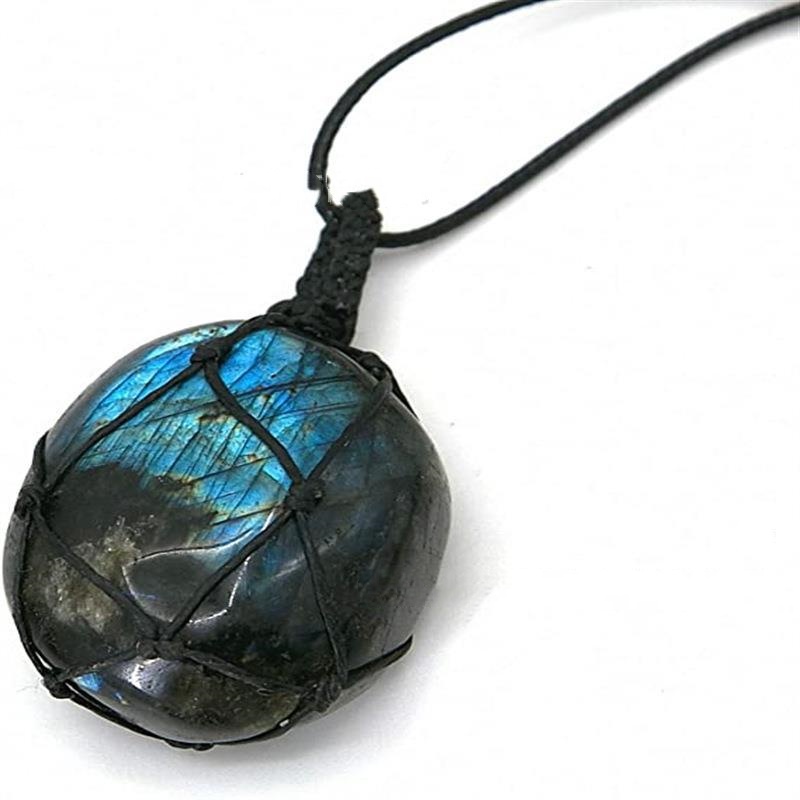 Product information:Name: natural labradorite hand-woven net bag pendant Size: 3.5-4.5cm Material: labradorite Process: Polishing