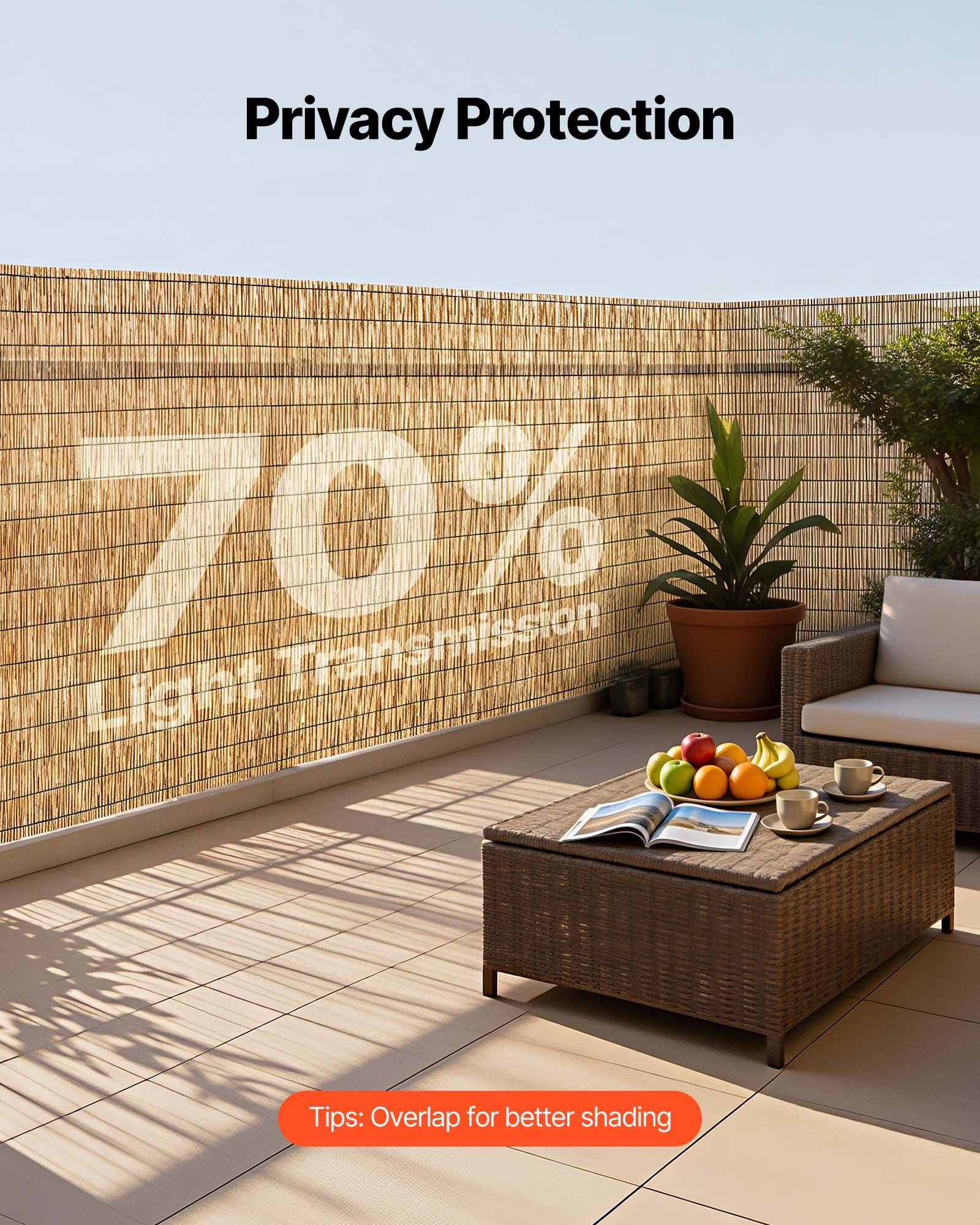 Privacy & Airflow: With 70% light transmission, this reed fencing roll blocks prying eyes and harsh sunlight while allowing airflow and soft light. It creates a private space without feeling closed in, ideal for backyards, balconies, and patios