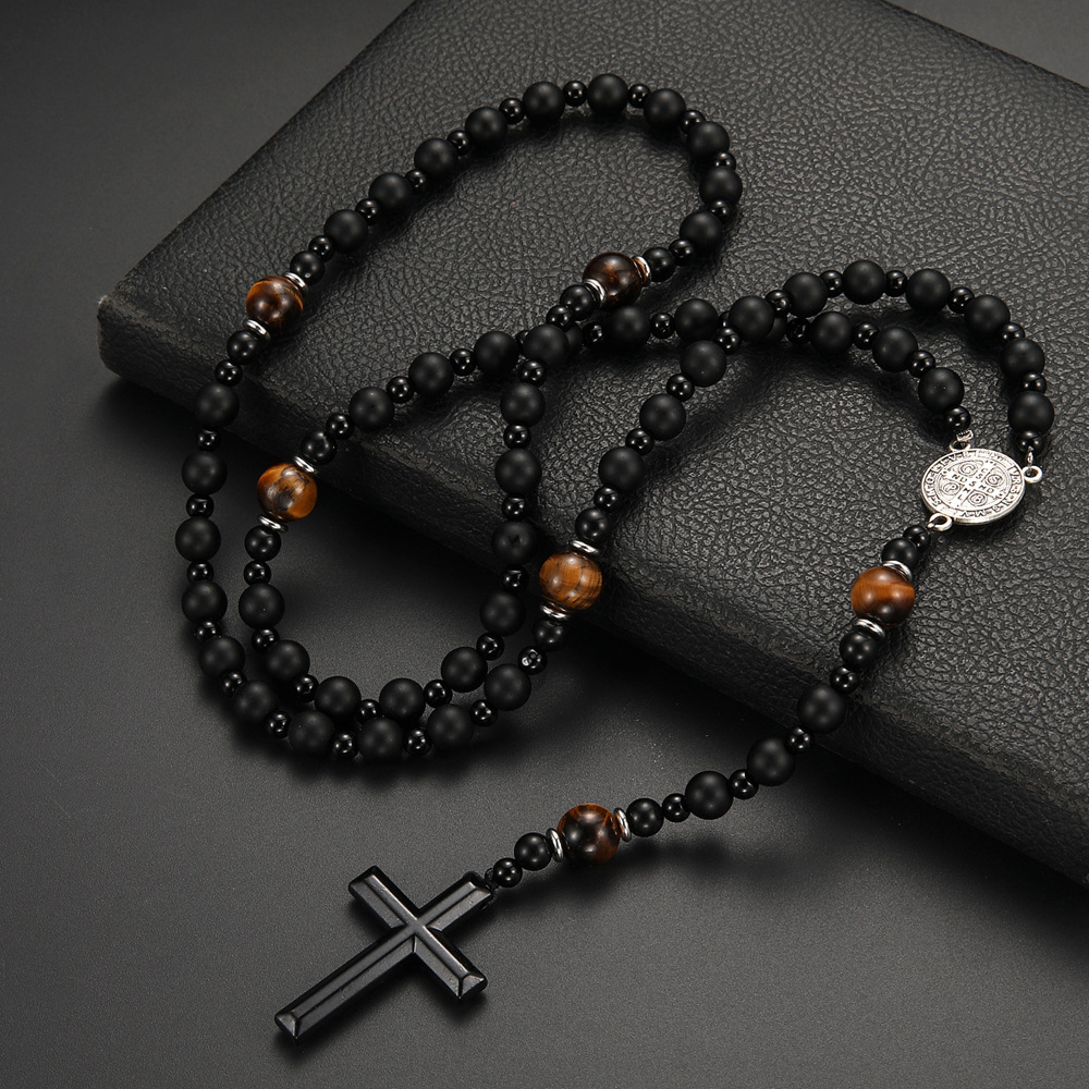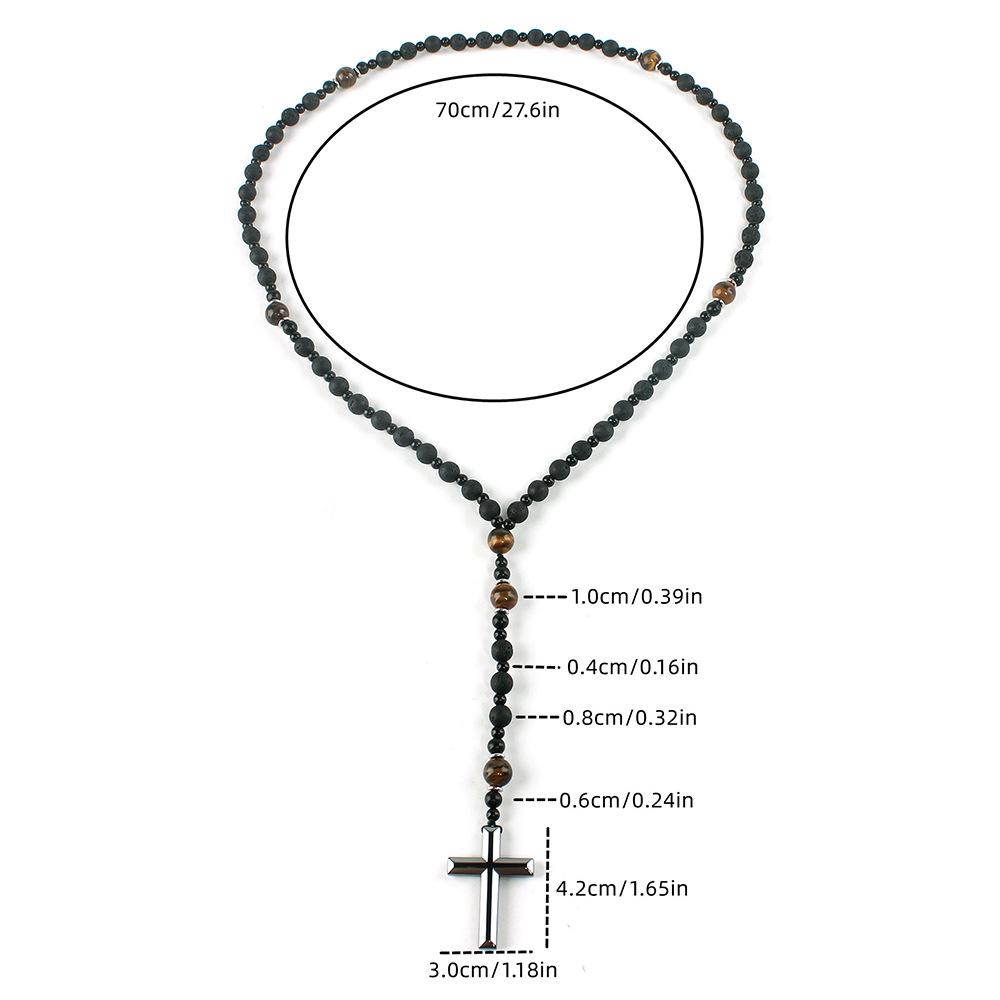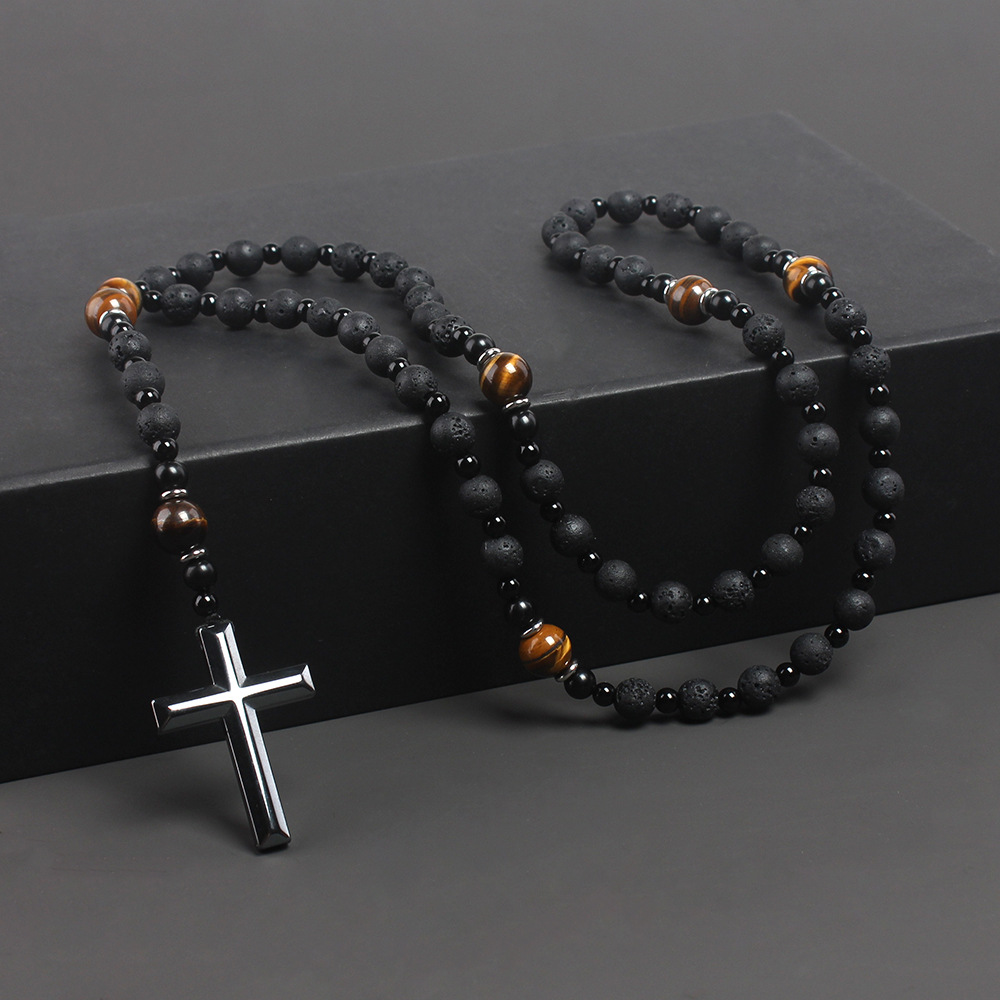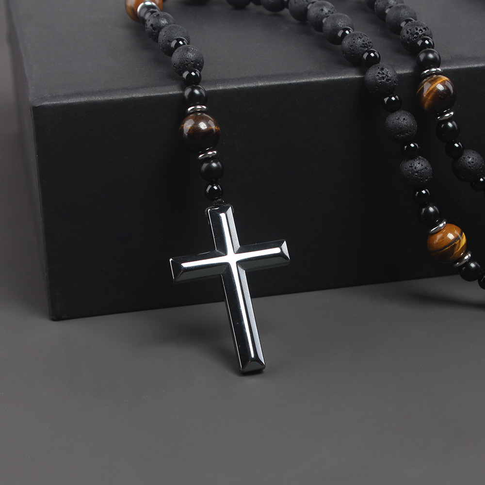Natural Stone Black Volcanic Rock Yellow Tiger Eyes Iron Stone Cross Necklace