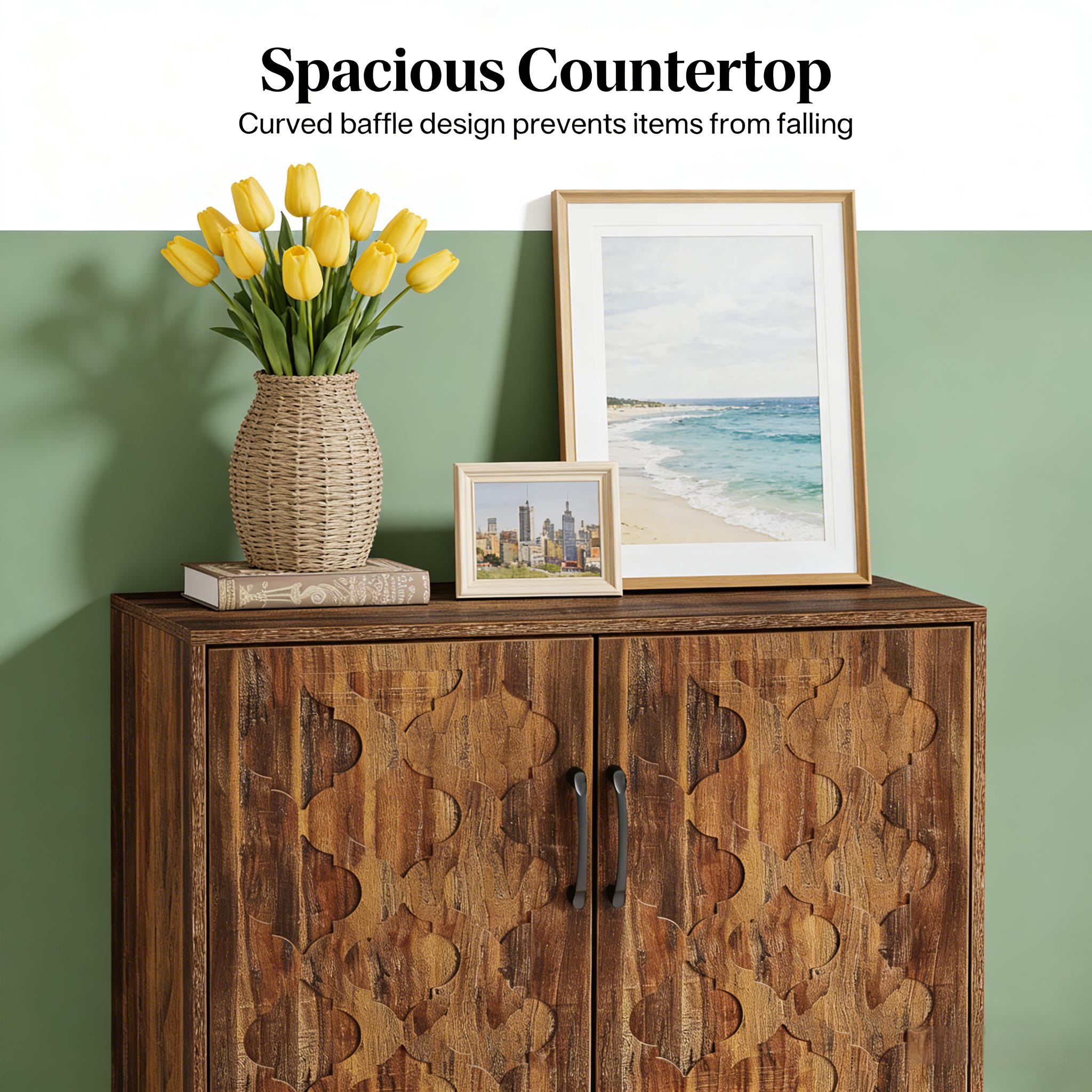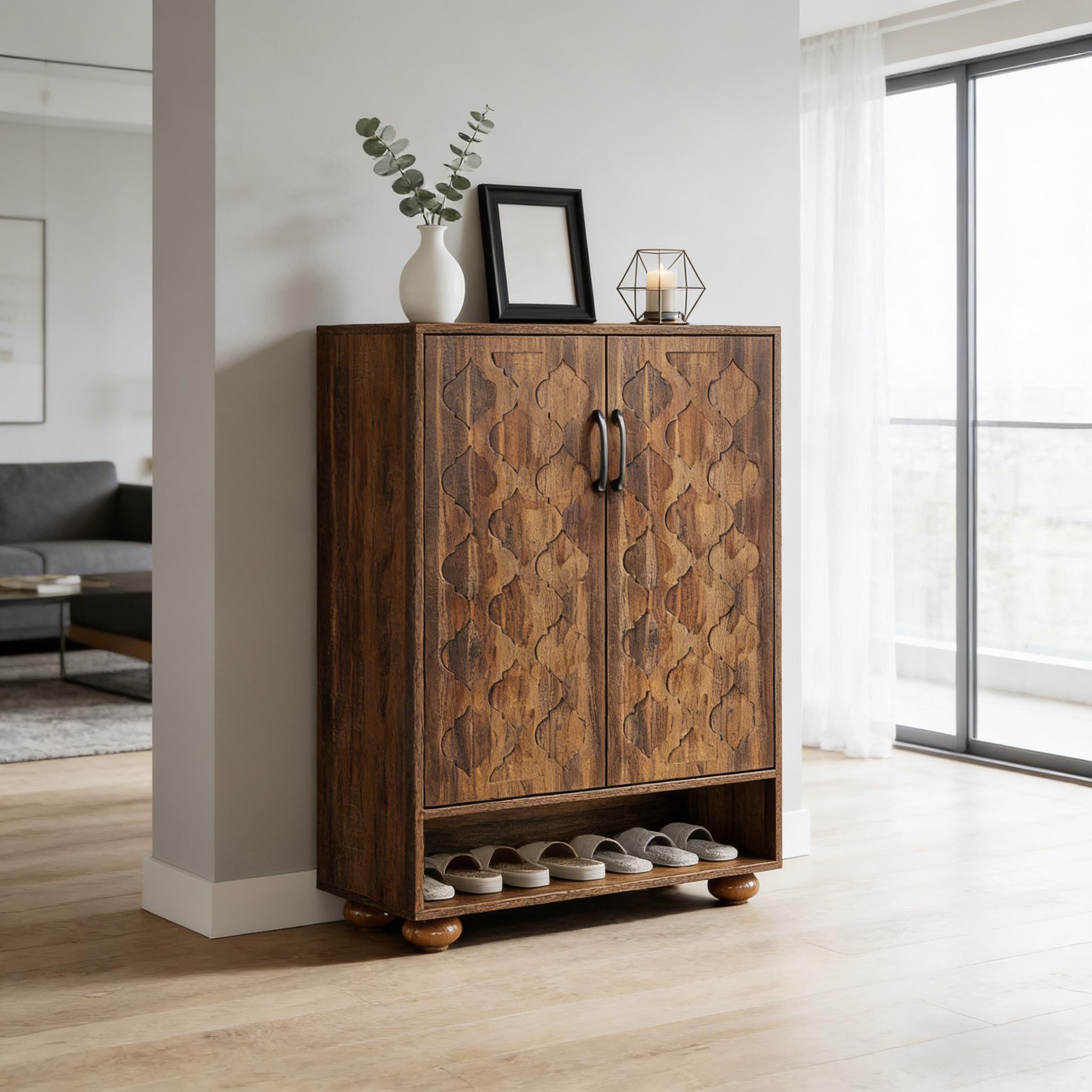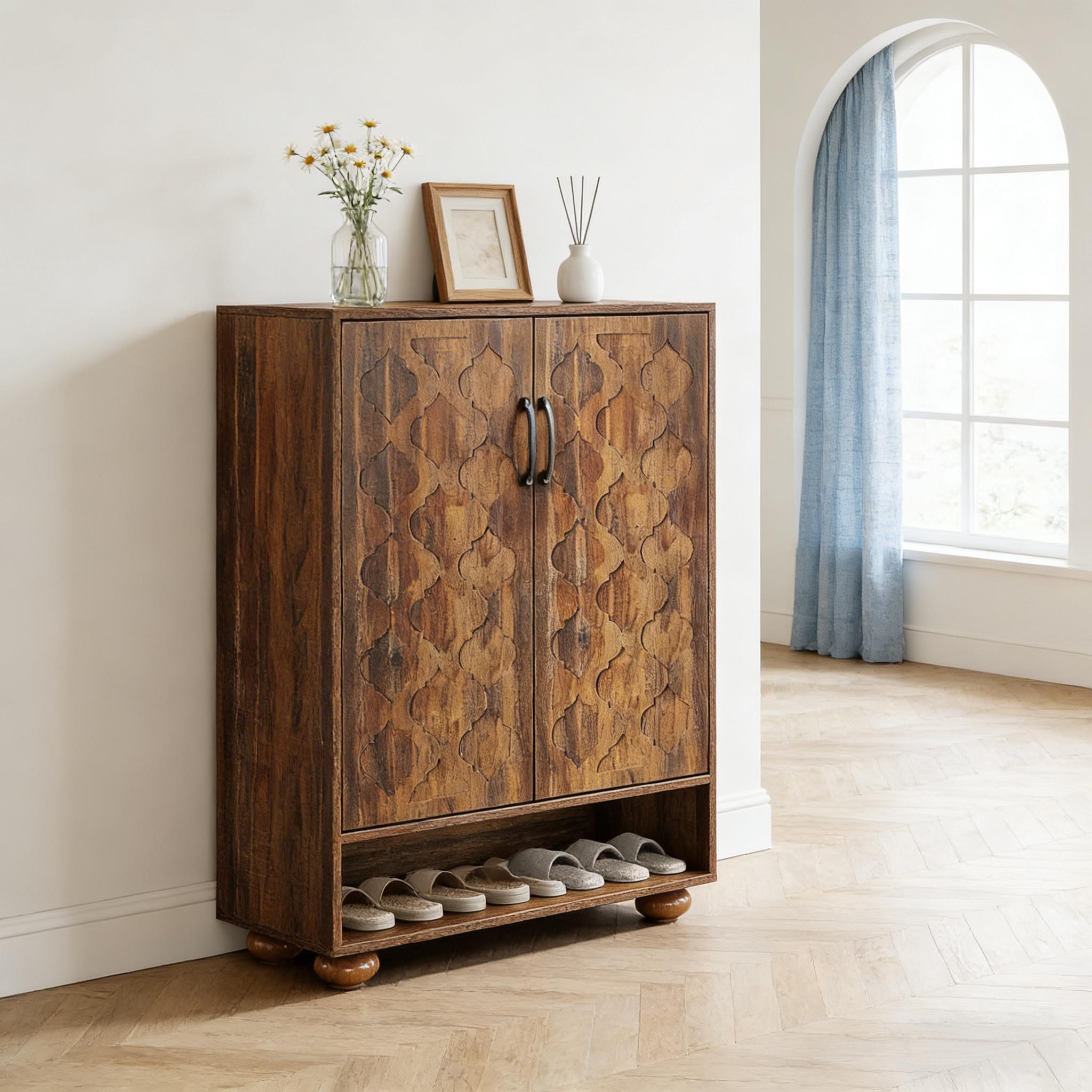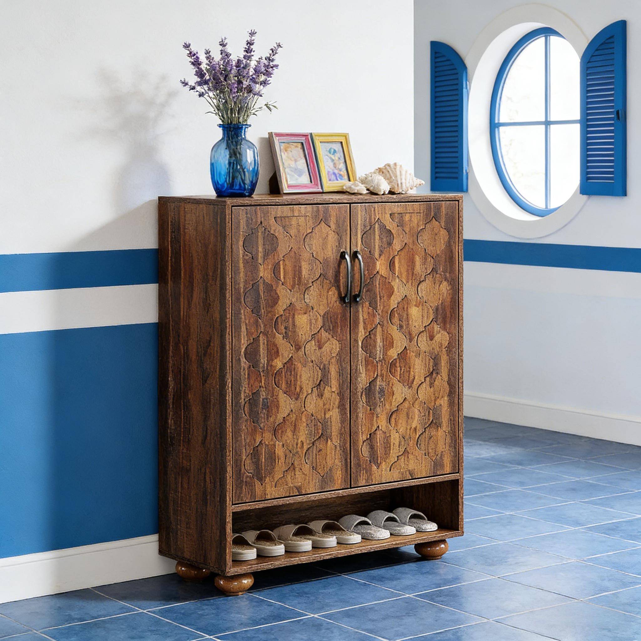 Important Reminder!!! 1) Attention: All products in our store do not support Canada self pickup ordering. Please do not create shipping labels for Canada. Our American products do not support self pickup to Canada 2)We do not ship to Alaska, Hawaii, US protectorates (e.g., Puerto Rico), P.O. boxes, or APO/FPO addresse 3)We don’t accept non-defective remorse returns Generous Storage Space - The six-level shoe cabinet integrates five closed compartments, one open shelf, and a generous tabletop for varied storage. At dimensions of 31.5" W x 13.8" D x 43.3" H, it can comfortably accommodate up to 24 pairs of shoes. Robust Construction - Crafted from high-quality medium-density fiberboard and supported by durable wooden legs, the shoe rack guarantees stability. This structure handles daily usage and heavy loads, ensuring lasting reliability. User-Friendly Design - Equipped with adjustable shelves, the shoe cabinet can easily accommodate different shoe heights. Ventilation holes are included in the design to promote air circulation and prevent unwanted odors. Vintage Elegance - The walnut storage cabinet features doors embellished with distinct patterns, combined with classic solid wood Roman column legs. This shoe rack organizer infuses any room with a touch of elegance and ageless allure. Simple Assembly - The entrance cabinet package includes labeled components and clear instructions for effortless assembly. Should you encounter any issues during installation or utilization, our dedicated customer service team is available to assist you.