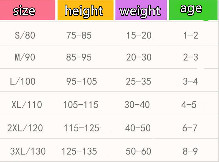 Size: 90 (height 85-95cm), 100 (height 95-105cm), 110 (height 105-115cm), 120 (height 115-125cm), 130 (height 125-135cm)