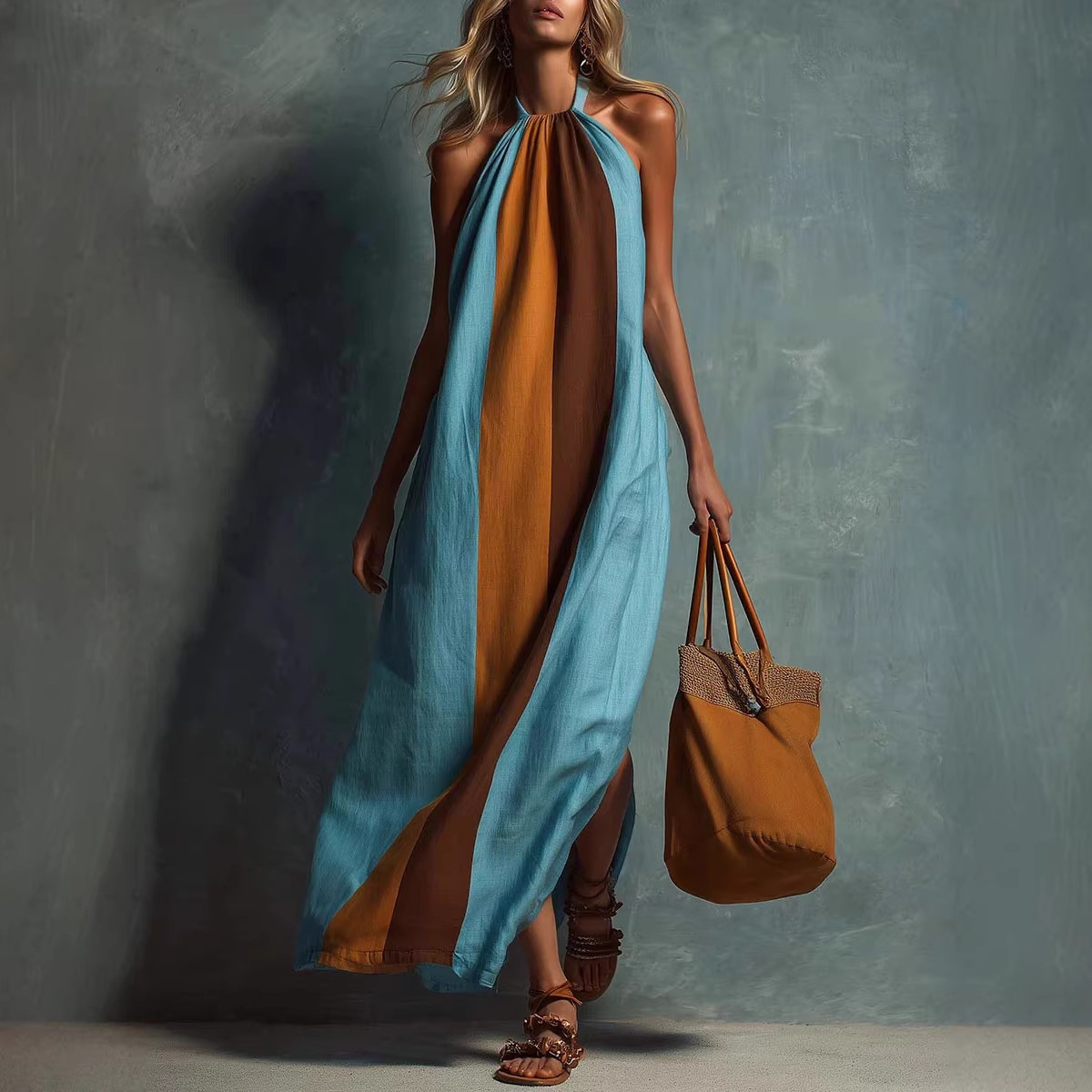 Neck-hanging Color-block Sleeveless Womens Long Dress