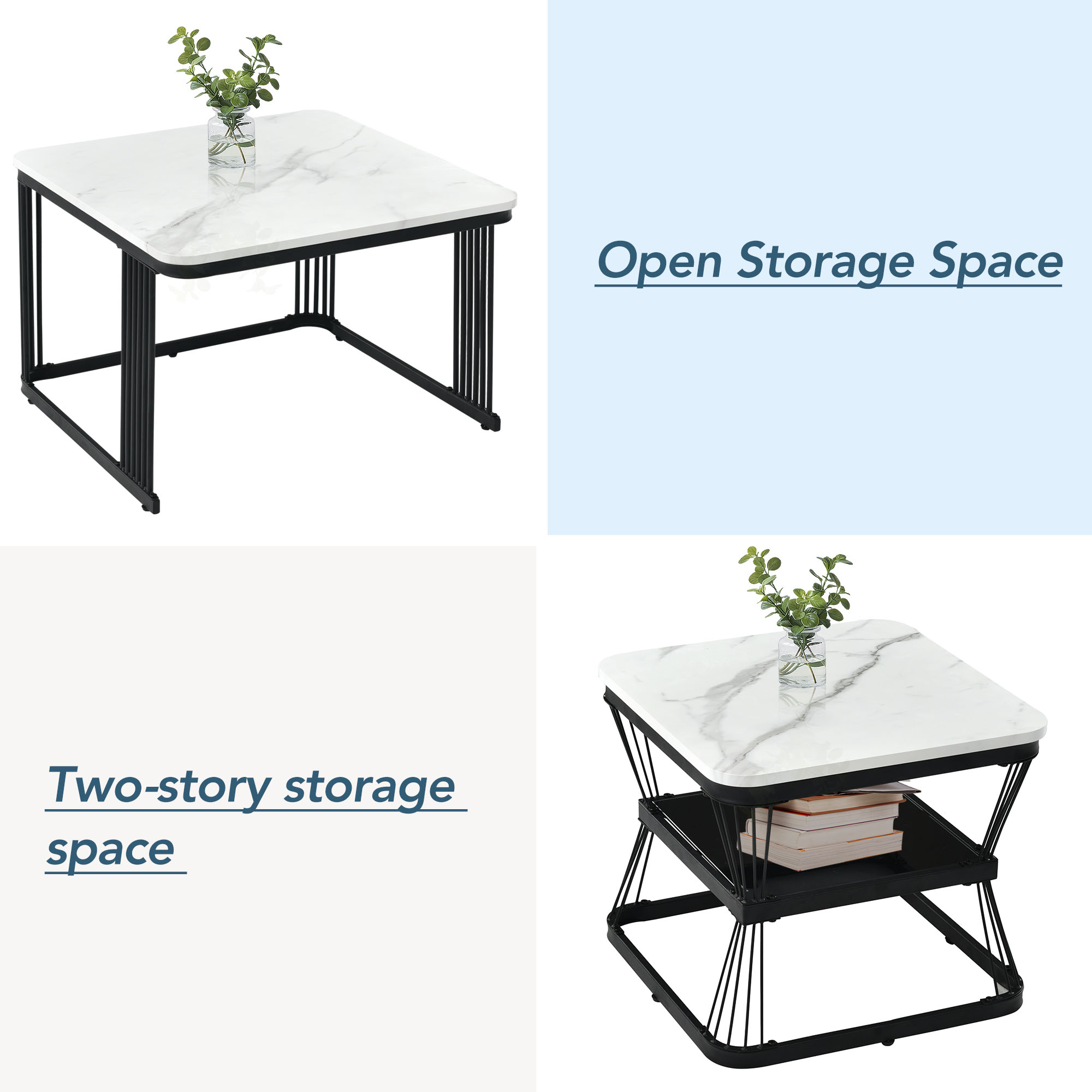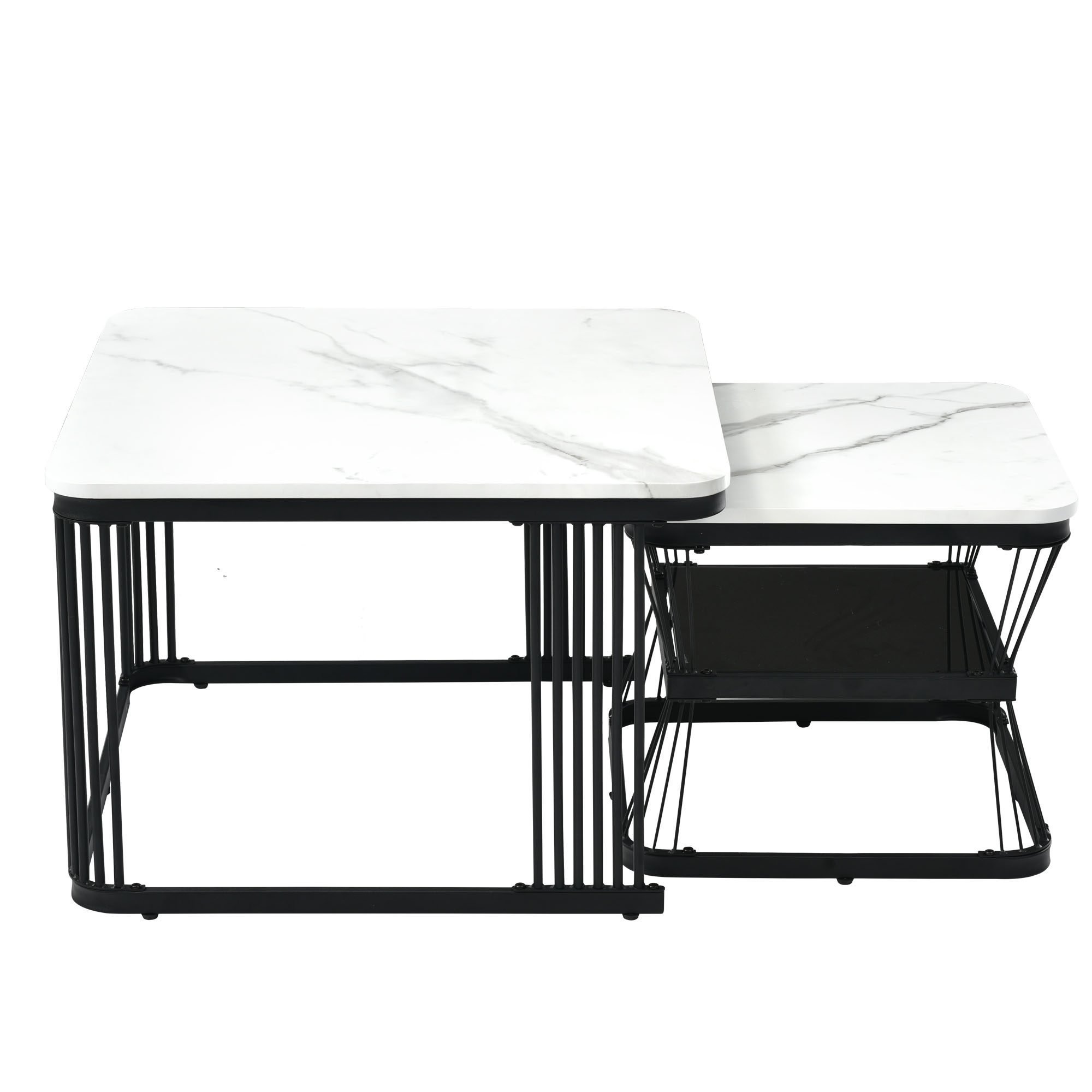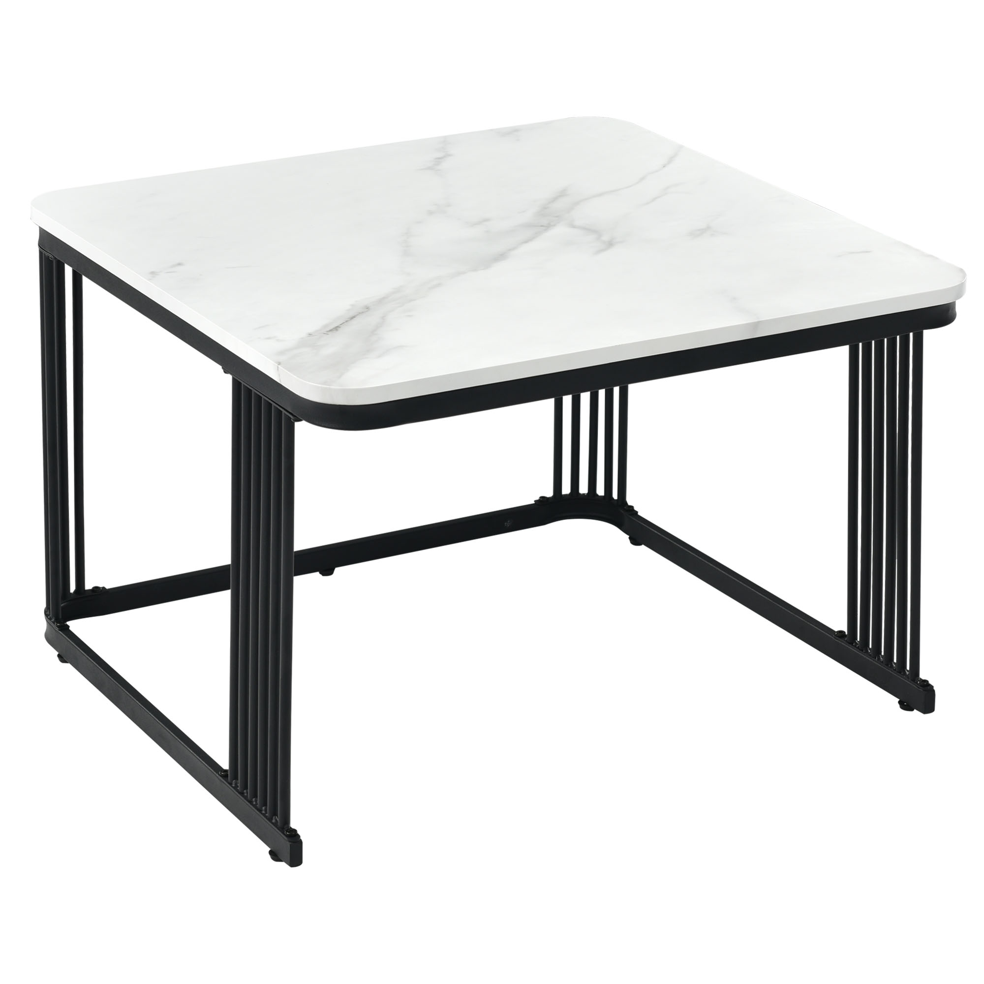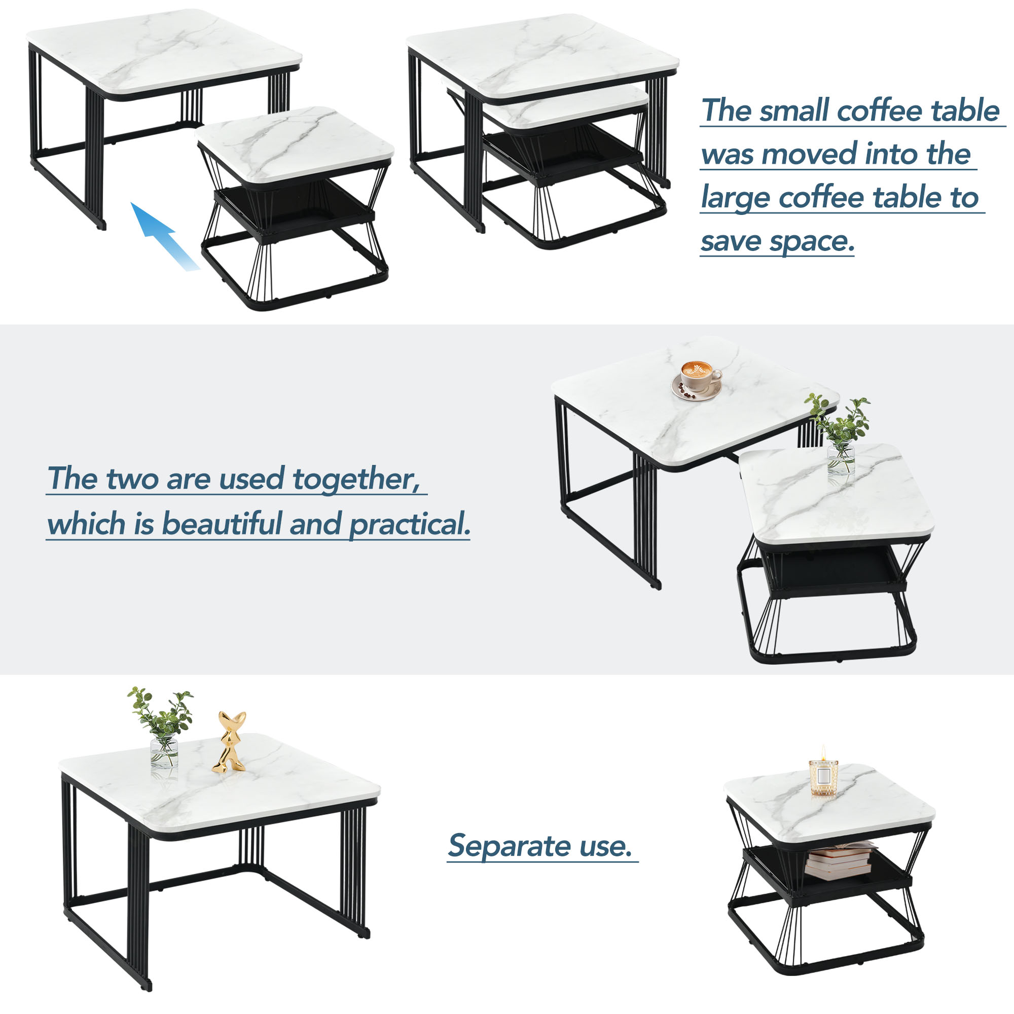 Product Name:Nest of 2 Tables Square Coffee Table Coffee Table Set Nesting Sofa Table Multi-functional End Side Table Nesting Tables with Black Metal Frame Legs and Marble Pattern White Top for Living Room Home